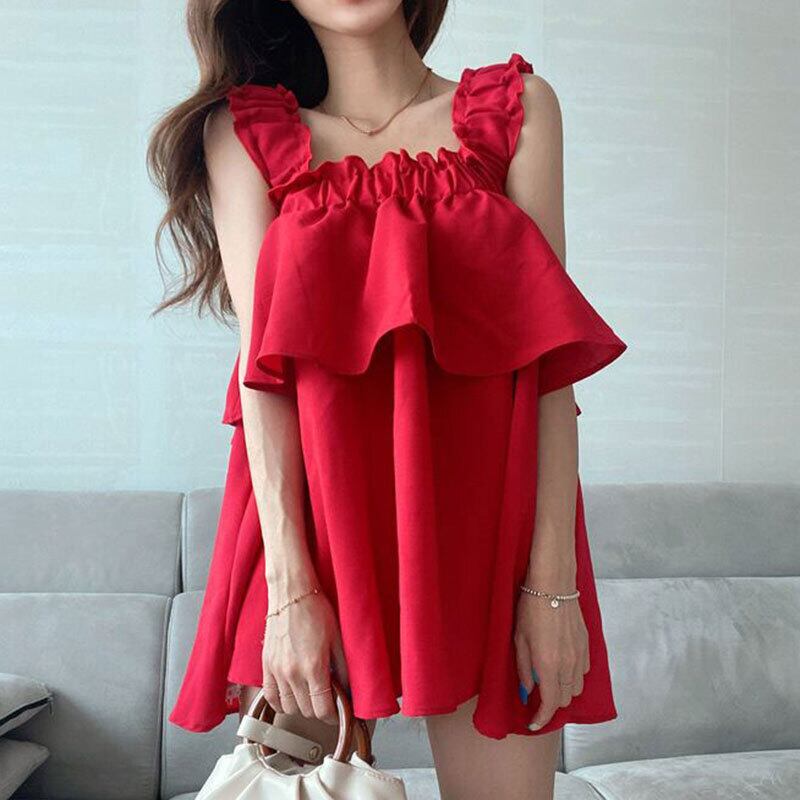 タンクトップルースキャミソール野生のシンプルなソリッドスクエアカラーダブルフリルブラウス夏ノースリーブ Blusa 女性シャツトップス サマー 夏物 ソリッドカラー スクウェア asa35931492526