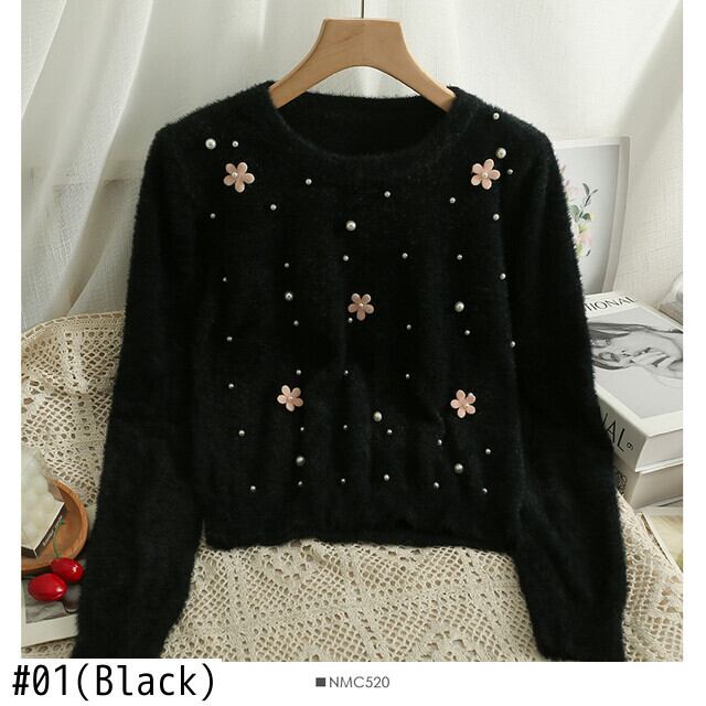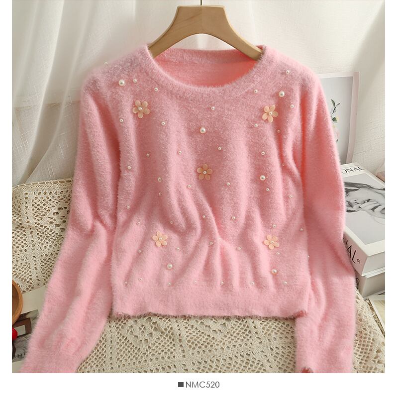 スウィートスリムロングスリーブプルオーバービーズセーター女性セーターニットトップス O ネッククロップドピンクセータージャンパー 長袖 大人ガーリー キュート カジュアル Oネック asa7506409389