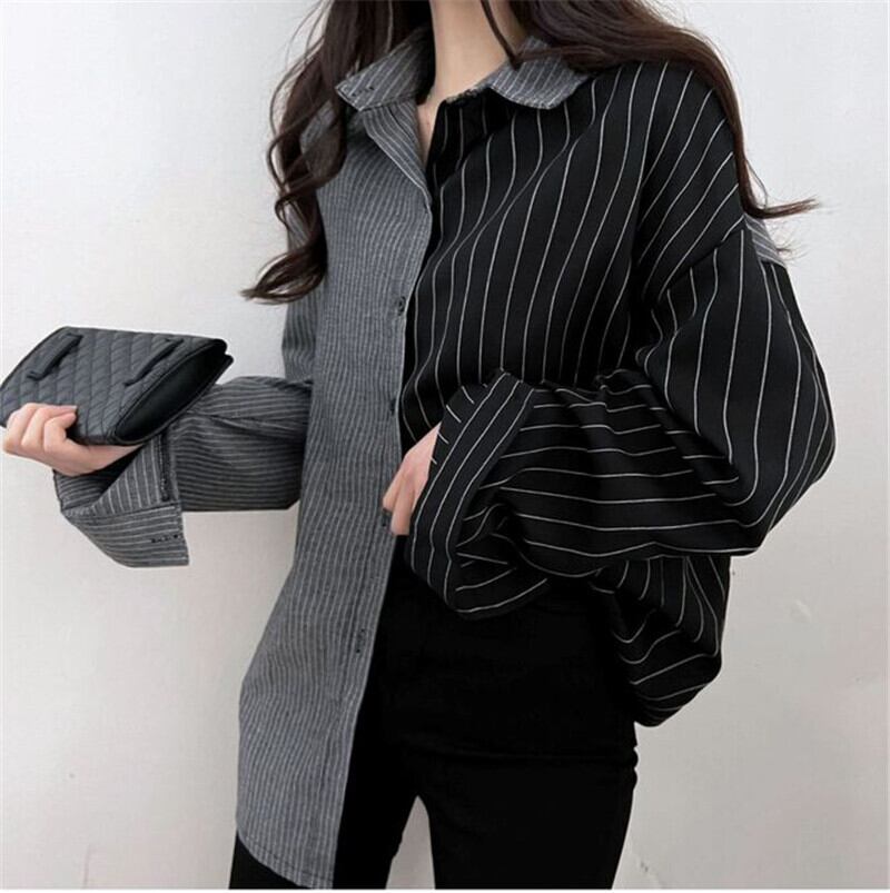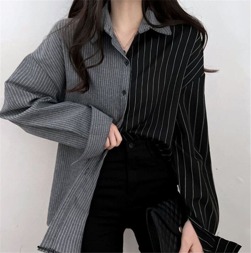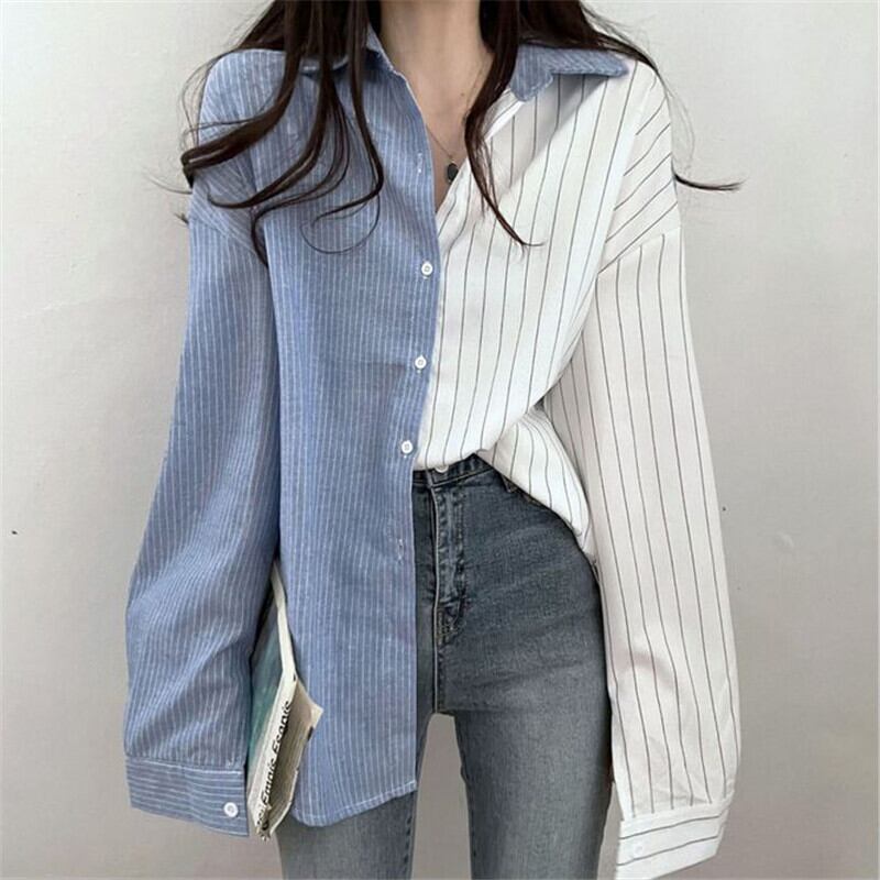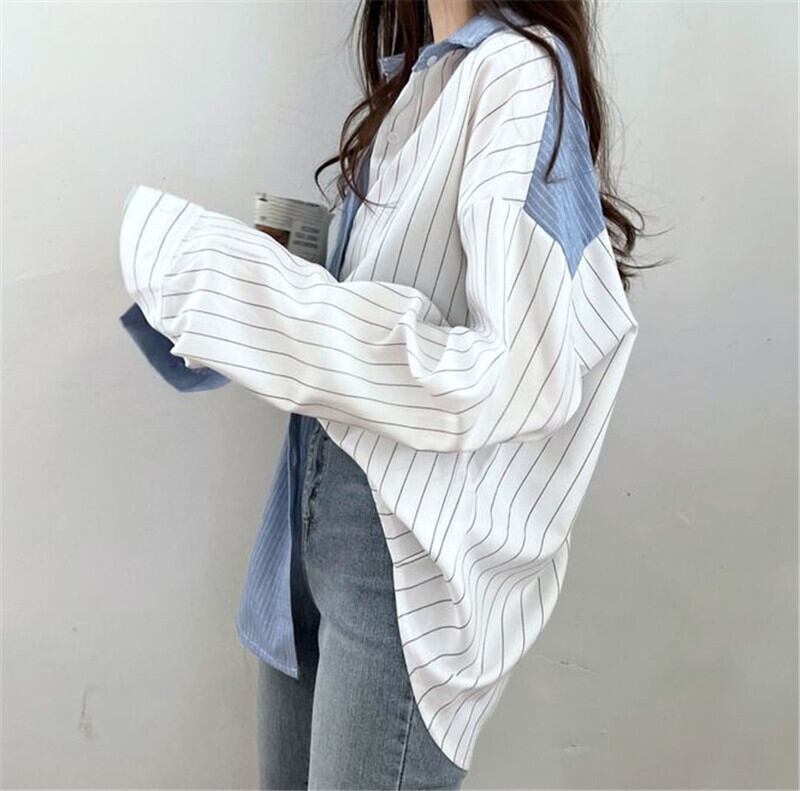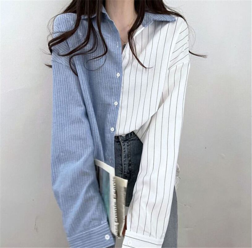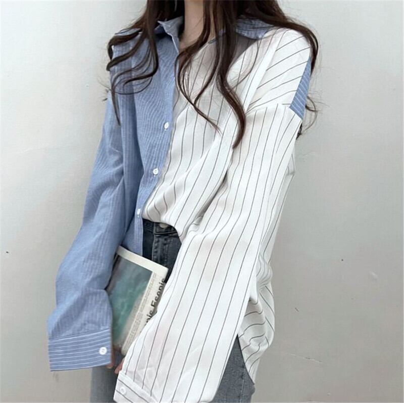 De Moda コントラスト ブルー ホワイト ストライプ シャツ レディース ルーズ トップス 春シャツ レディース スプリング 春物 asa89377898157