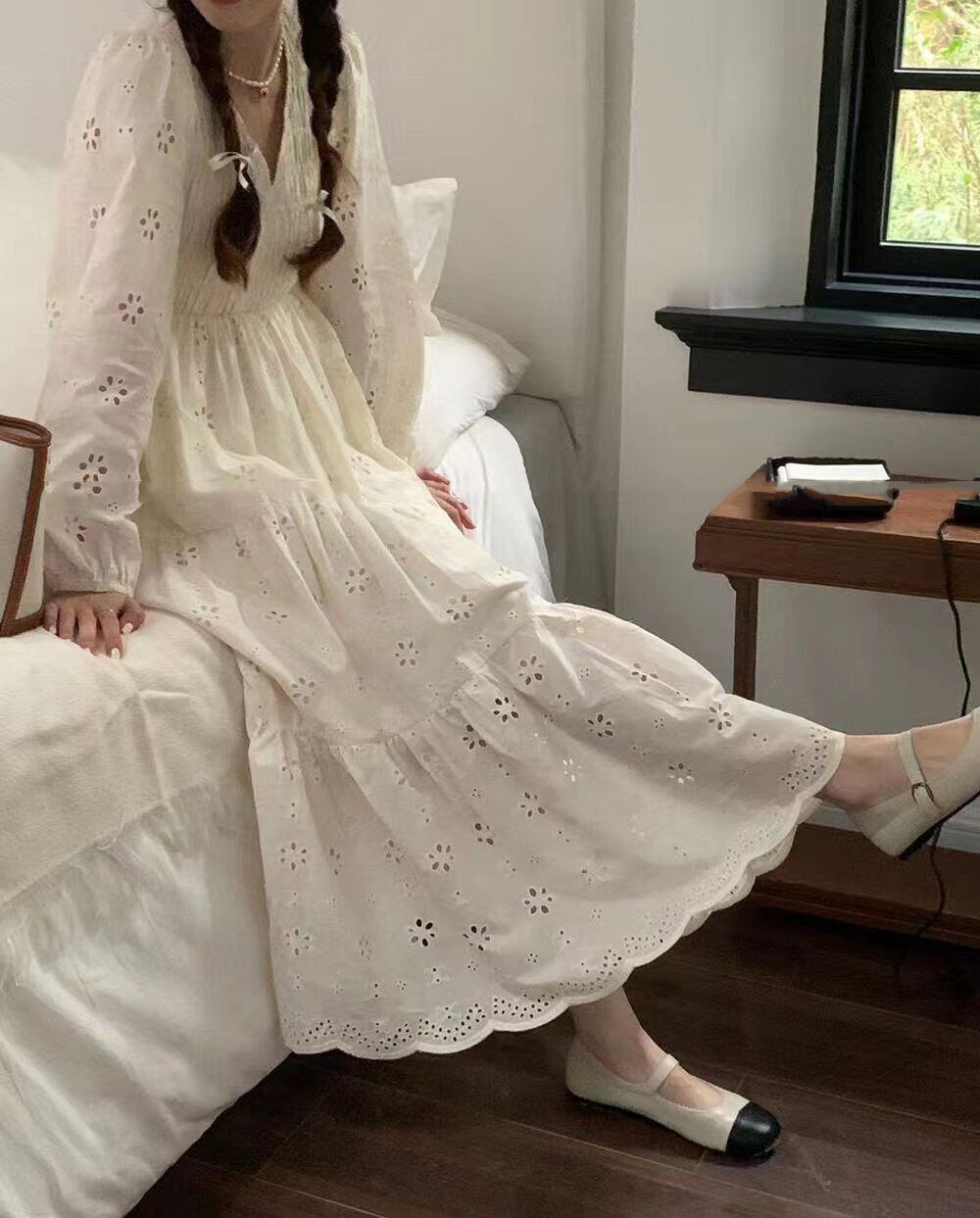 Vestidos V 中空花プリーツ長袖刺繍ドレス女性シックなミディロングローブパフ春 スプリング 春物 フラワーデザイン asa62906942974