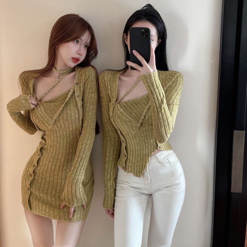 シックなセクシーな Y2k Vestidos ニットホルタードレス女性ミニスプリット長袖タイトな不規則なビーチ膝上ドレス ロング asa79584250488