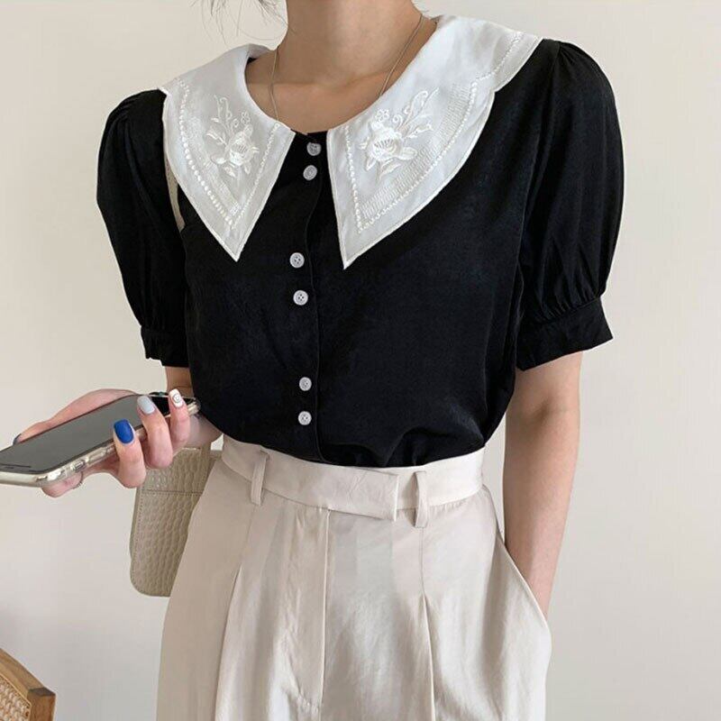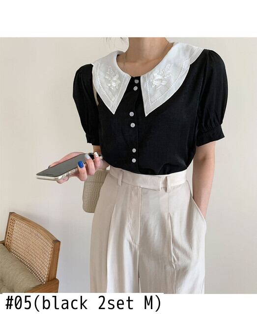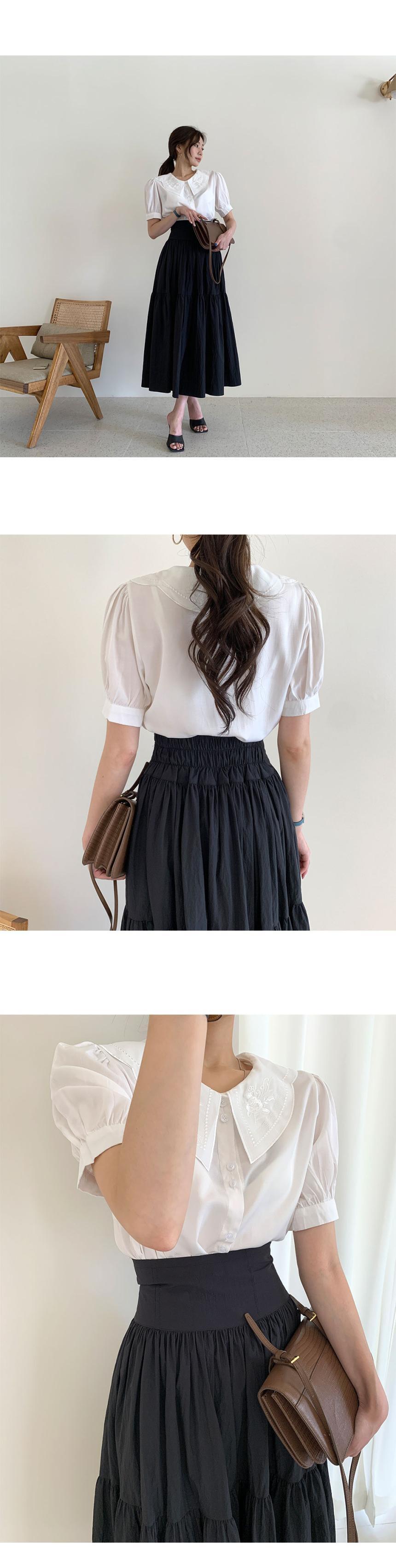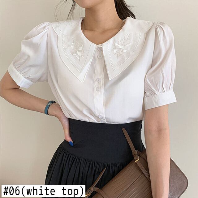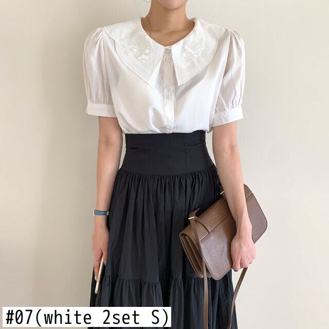 ワイルドラペル刺繍半袖シャツホワイトドールトップスブラウスシャツAラインウエストプリーツスカートセット ショート レッド ハーフスリーブ asa34368601793