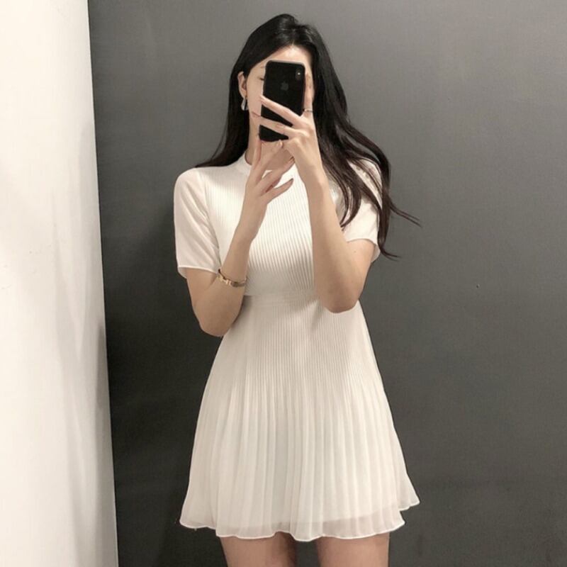 A ライン スタンド スリム レディ ホワイト プリーツ シフォン ドレス女性ローブ Vestidos デ半袖ドレス OL ワイルド セクシー ショート ハーフスリーブ asa7246901169
