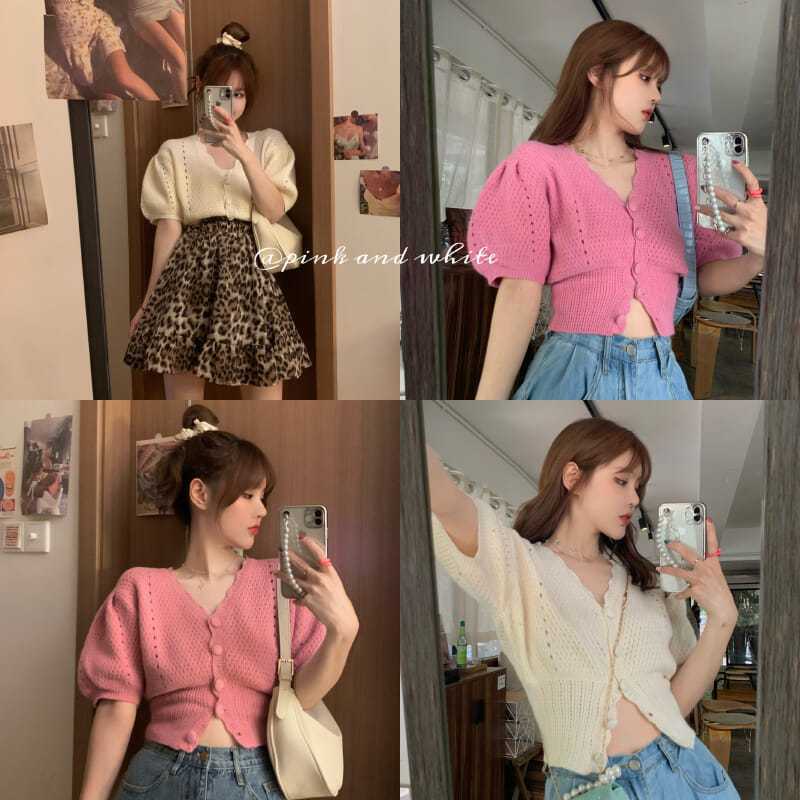 スウィート ブラウス パフ 半袖 ピンク カーディガン スリム V クロップド カーディガン トップス 春 セーター ジャケット シック シャツ ショート ハーフスリーブ 大人ガーリー キュート カジュアル スプリング 春物 asa42501447387