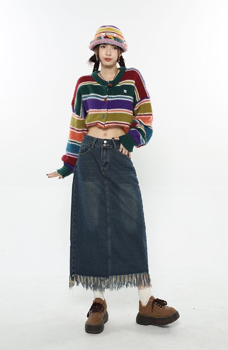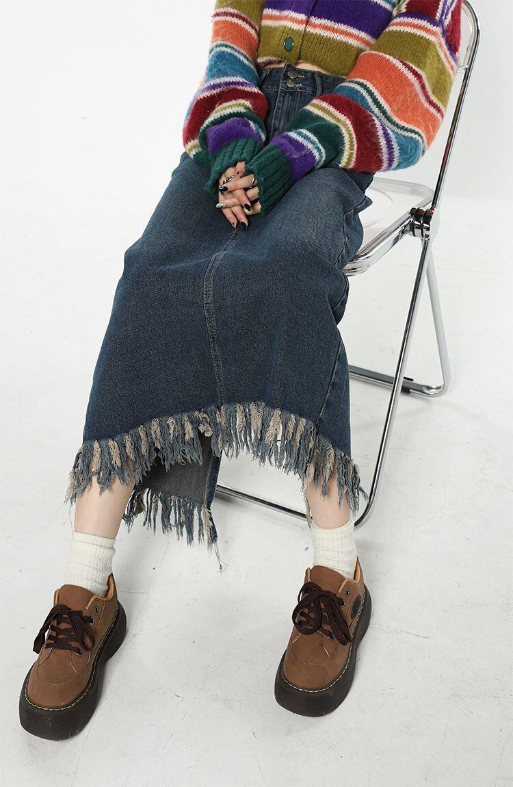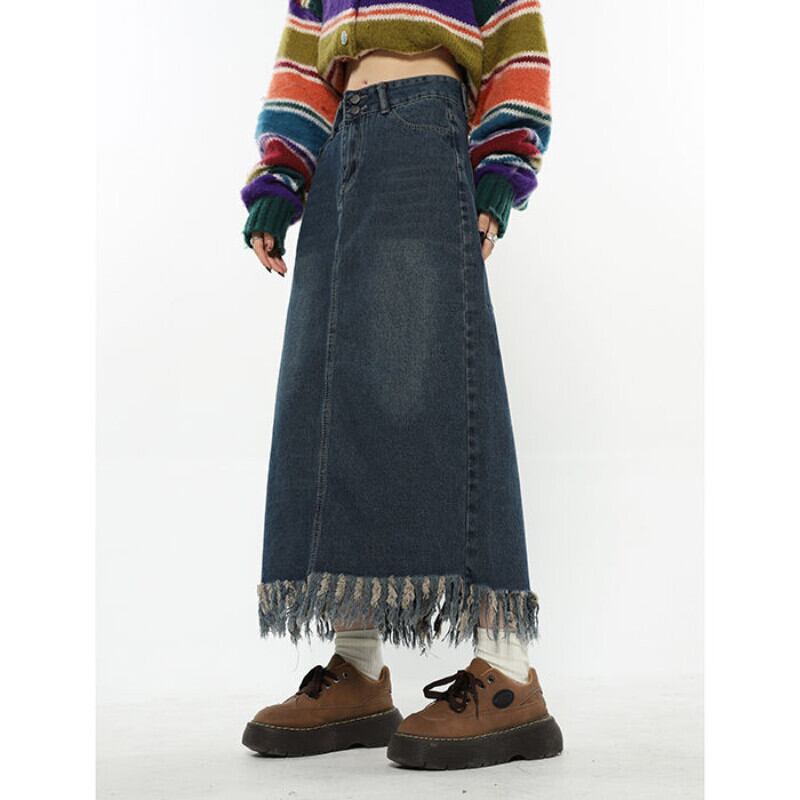スリム A ラインフリンジデニムスカート女性ロングペチコート段 Faldas Largas 秋ウエストミディマキシジーンズスカート オータム 秋物 Aライン asa69235199207
