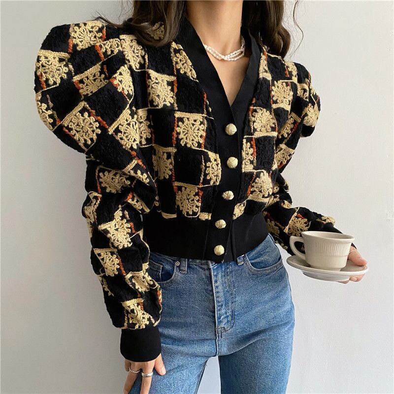 ニットカーディガン Y2k 洋服 Vネック ジャカード刺繍 パフスリーブ フラワーニットカーディガン 黒 ジャケット セーター レッド ブラック フラワーデザイン asa82538105983