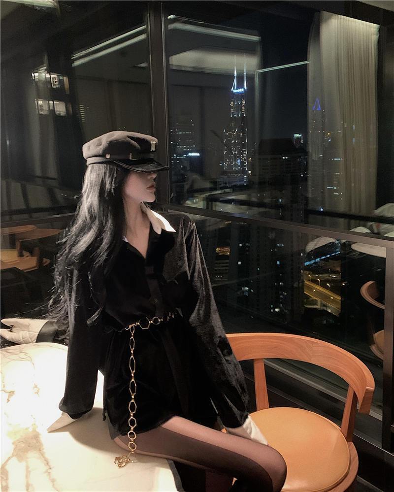 フランスの長袖不規則な黒のベルベットのシャツの女性ベルトウエストルーズトップス春ブラウスシック ロング ブラック スプリング 春物 ハーネス asa78816600761