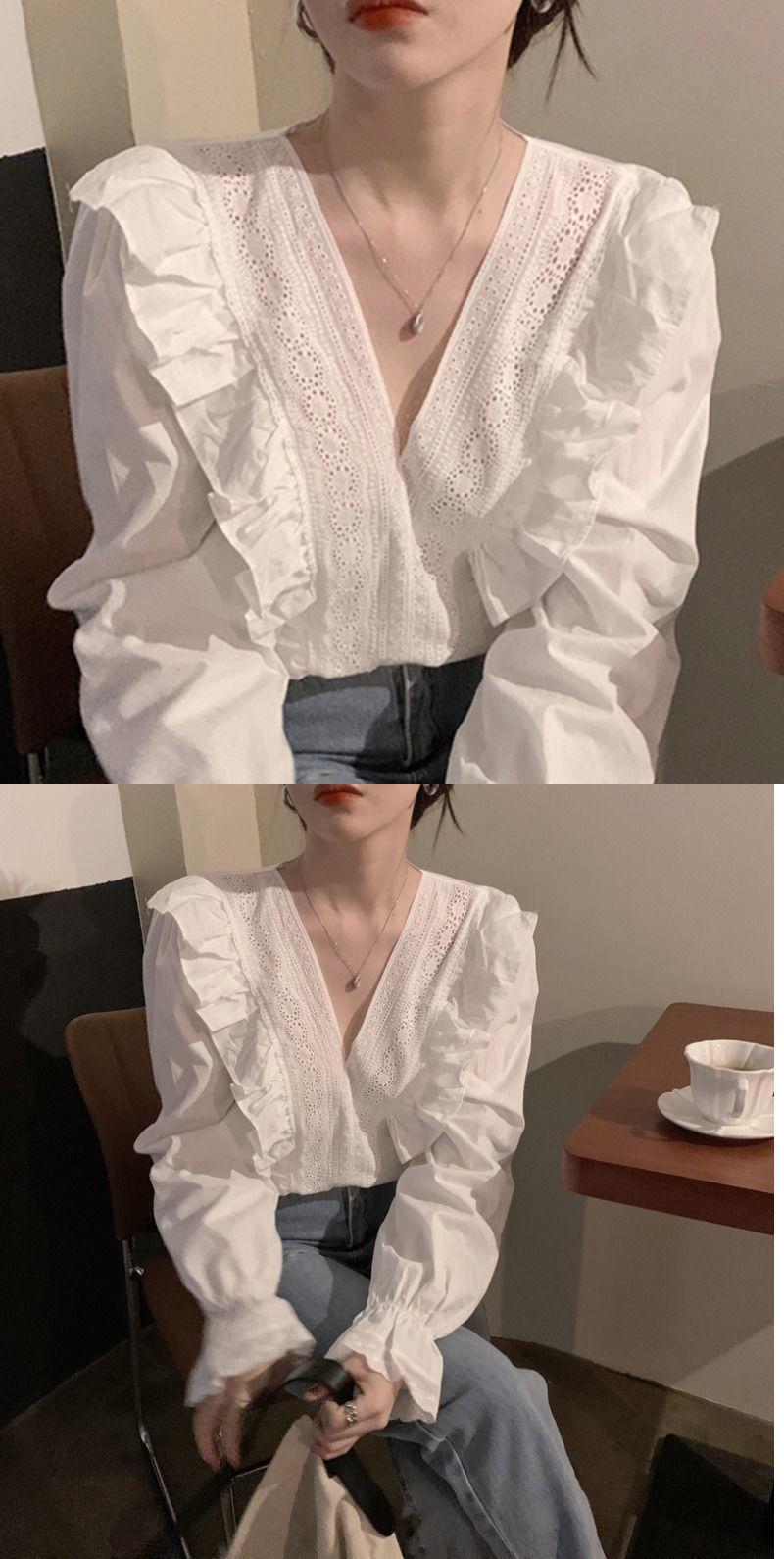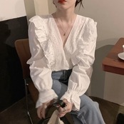 宮殿スタイル白シャツ女性フリル レース シャツ V ネック トップス シックな Blusa 春ブラウス野生 ホワイト スプリング 春物 Vネック asa84099391399