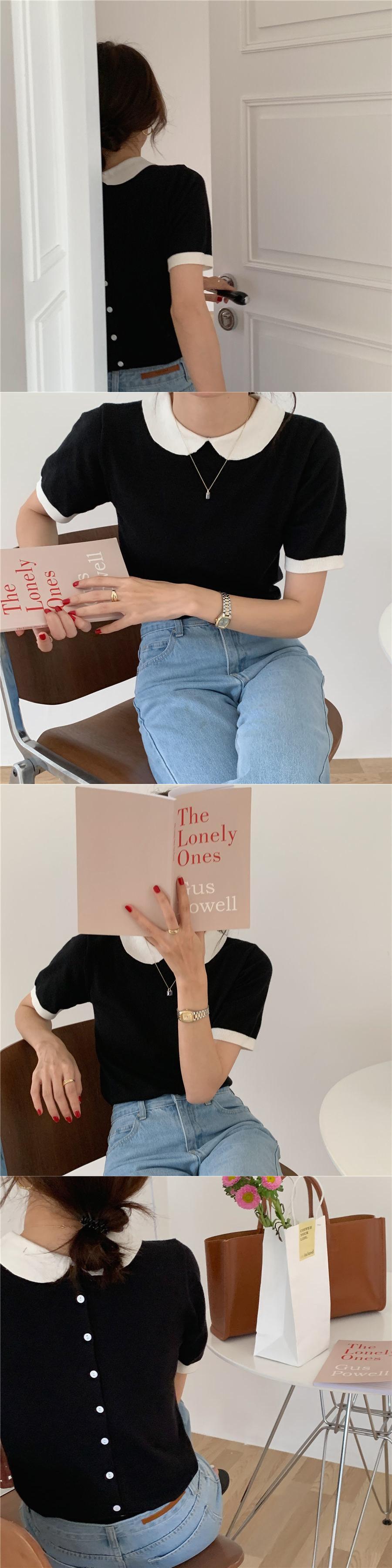 夏ニット Tシャツスタイルコントラストピーターパン襟バックシングルブレスト Tシャツスリムストレッチ Tシャツ黒トップス ブラック サマー 夏物 asa67261591866