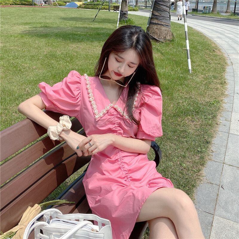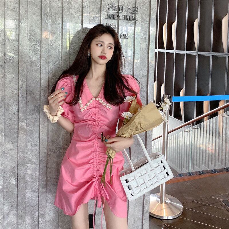 サマードレス Vestidos デ巾着プリーツパール V ネックバブル半袖 A ラインビーズドレス女性甘い夏 ショート ハーフスリーブ 大人ガーリー スウィート キュート カジュアル 夏物 Vネック Aライン 真珠 asa9441217268