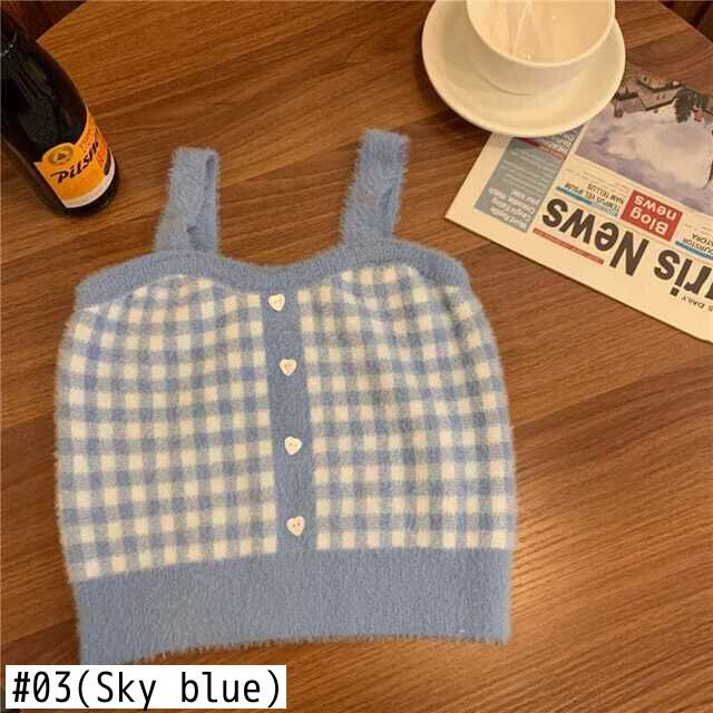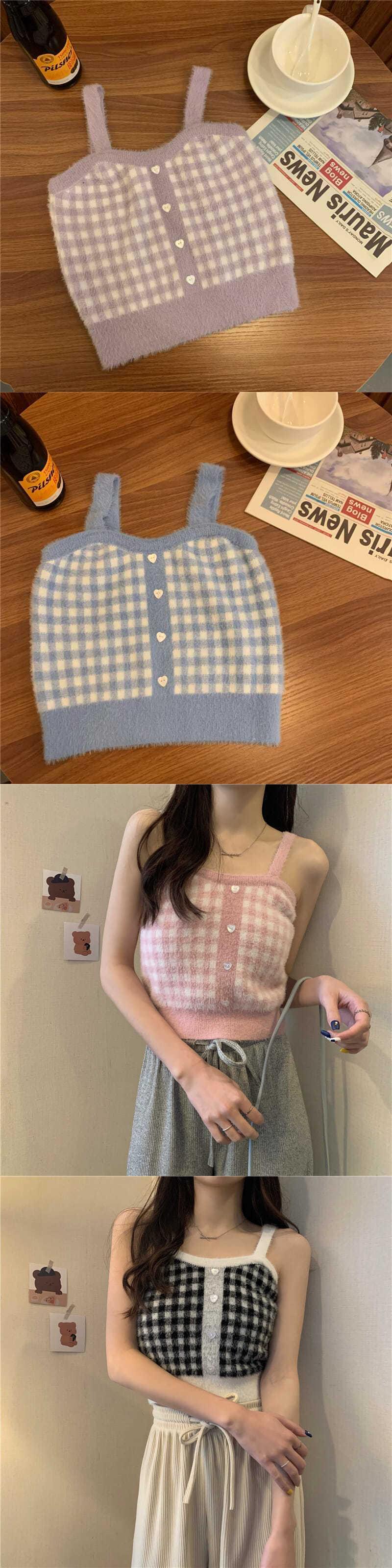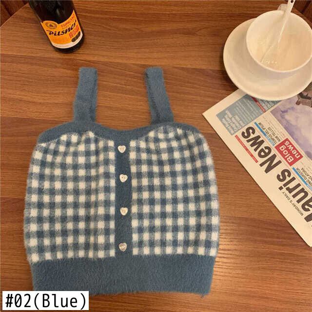 セクシーなクロップトップス Tシャツスリムタンクチェック柄キャミソールフリースファーノースリーブブラウスシックなボタン春夏 Tシャツ女性の スプリング 春物 サマー 夏物 asa18626596385