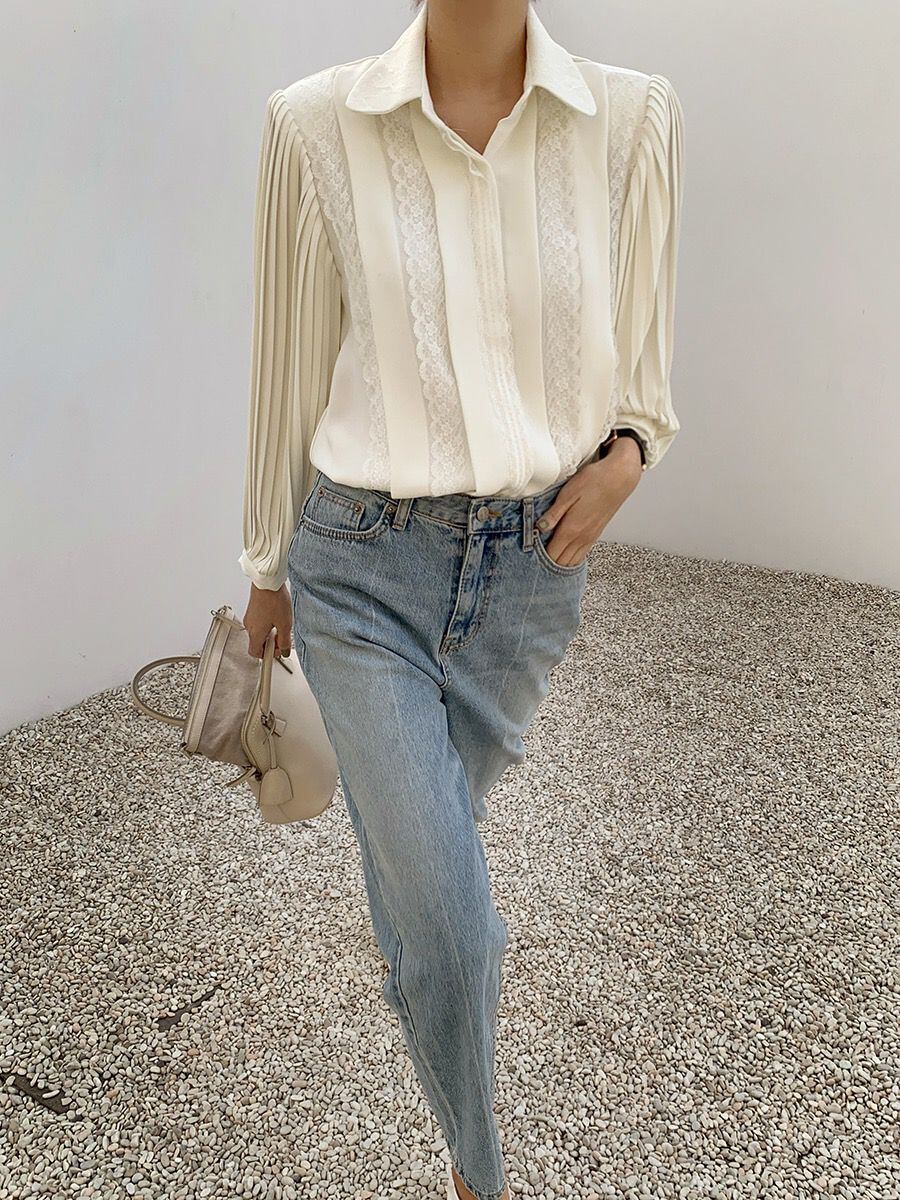 シックなランタンスリーブラペルレースフリルシングルブレストルーズホワイトプリーツシャツ女性トップスレディブラウス asa74745538408