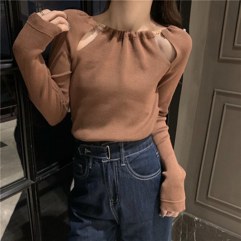 ワイルドスリム O ネック中空アウトチェーンセーター女性セータージャンパーニットトップスクロップド黒セーターレトロシャツ ブラック Oネック asa36085662106