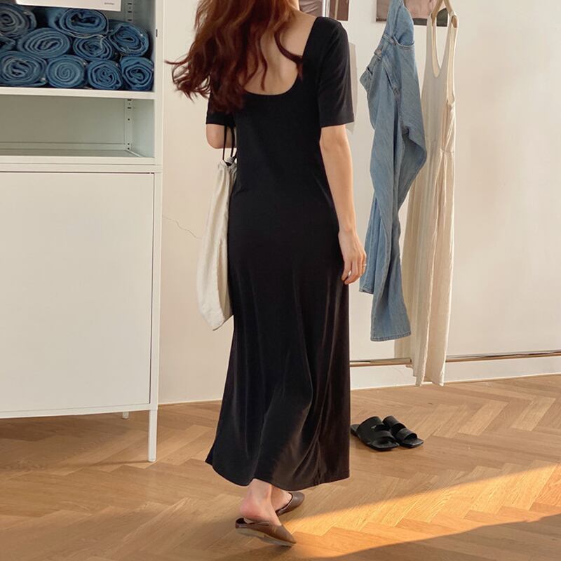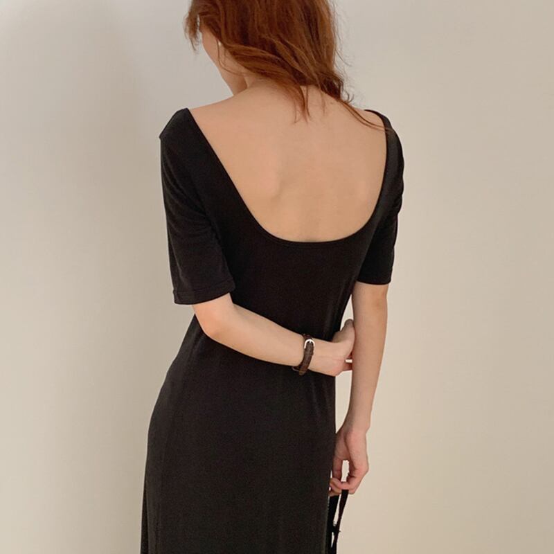 A ライン スクエア半袖黒ドレス女性ミディ綿セクシーな背中の開いたボディコン ドレス ローブ Vestidos デ ショート ブラック コットン ハーフスリーブ スクウェア asa8892325271