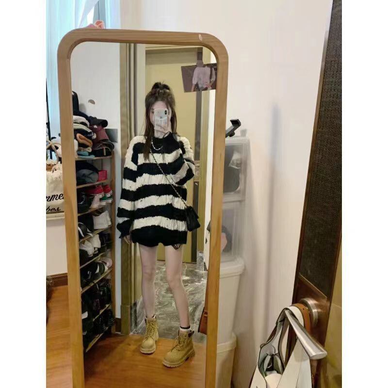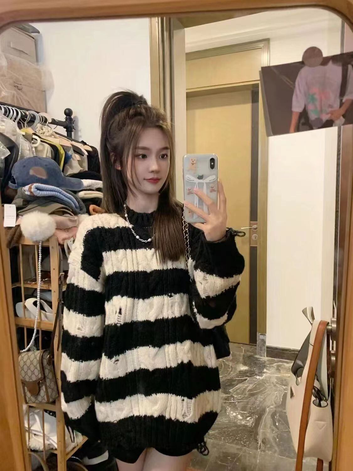 ルーズロングスリーブストライプホールセーター女性 Y2k ピンクブラックニットトップスプルオーバーセーターツイストセーター春 長袖 スプリング 春物 asa36370768562