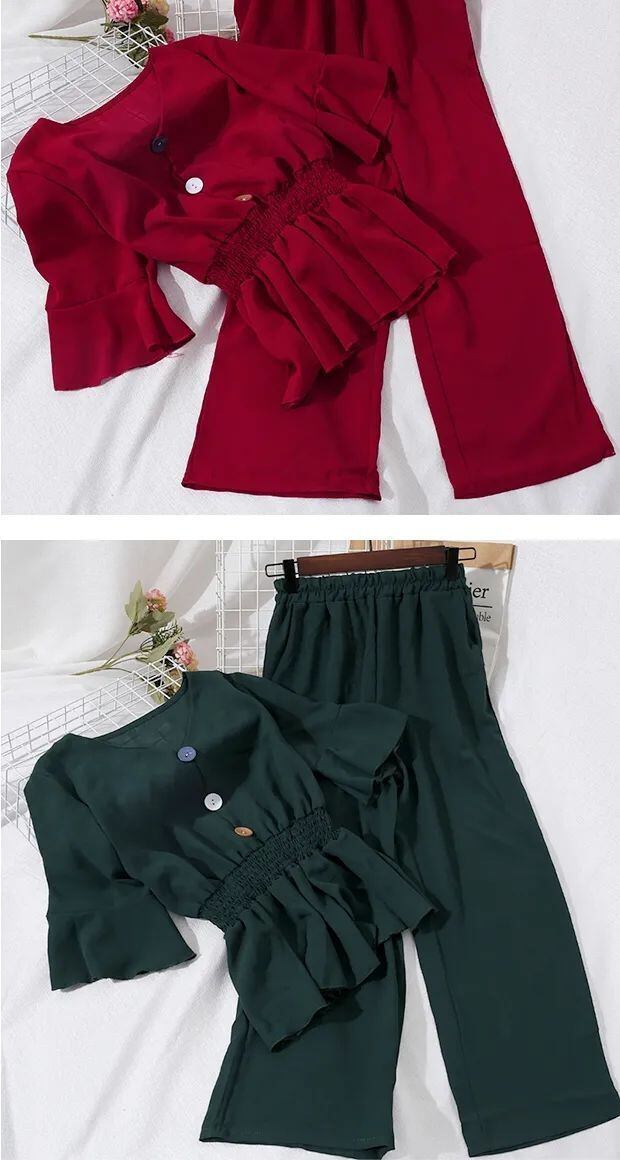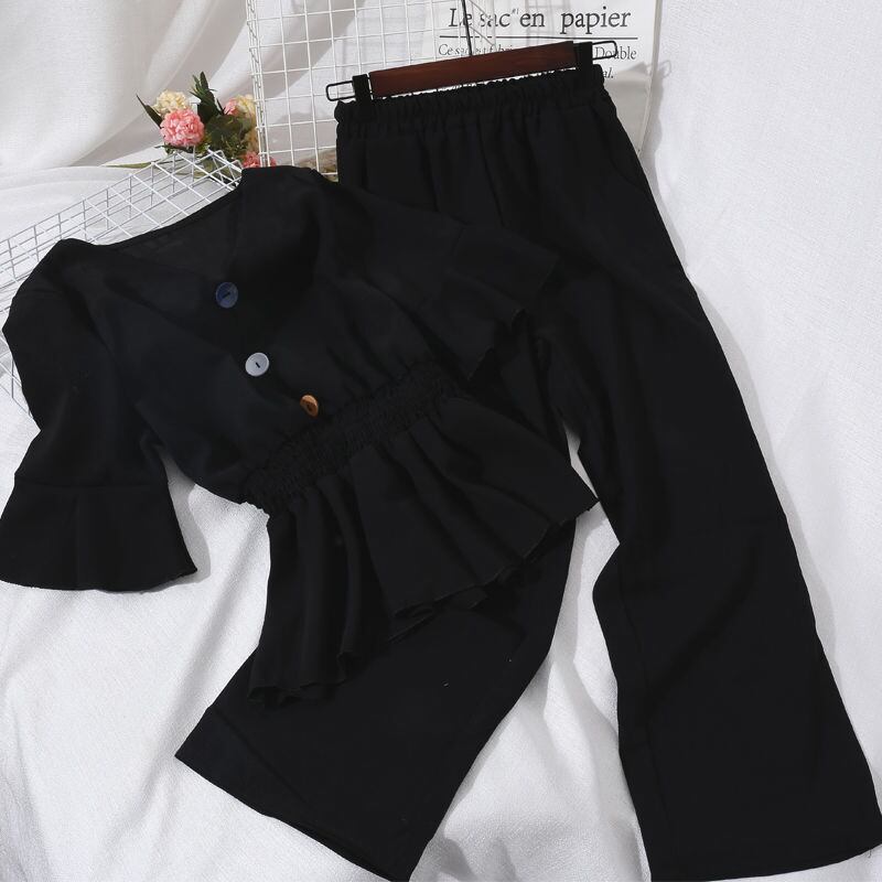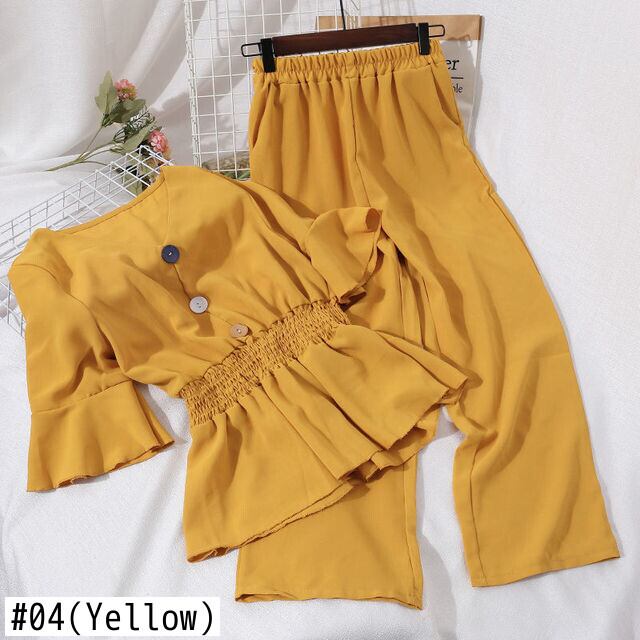 スリム V ネックウエストフリルトップウエストワイドレッグパンツ 2 点セットハーフスリーブブラウス弾性シャツ女性トラックスーツショート 半袖 エラスティック 伸縮 Vネック ワイドパンツ asa30445611161