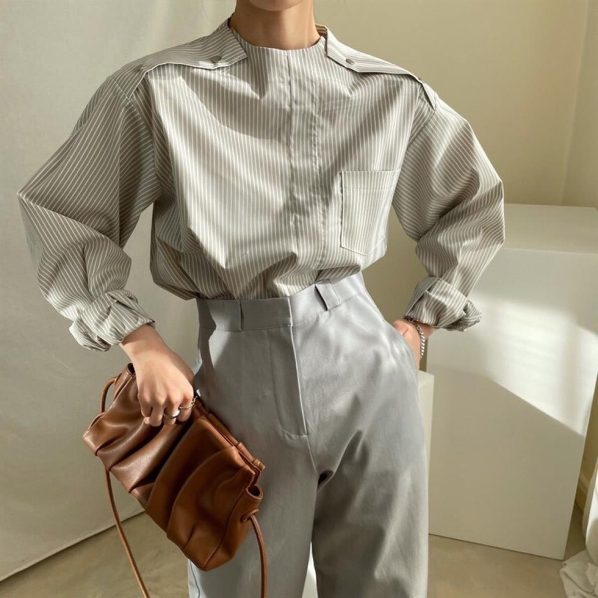 緩い秋スタンドメタルボタンポケットランタンスリーブブルーストライプシャツ女性ブラウストップス女性シャツ オータム 秋物 asa2337307571