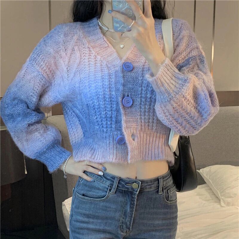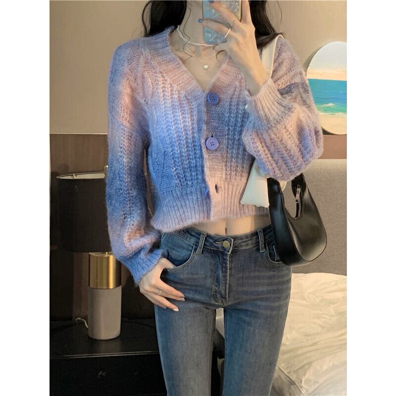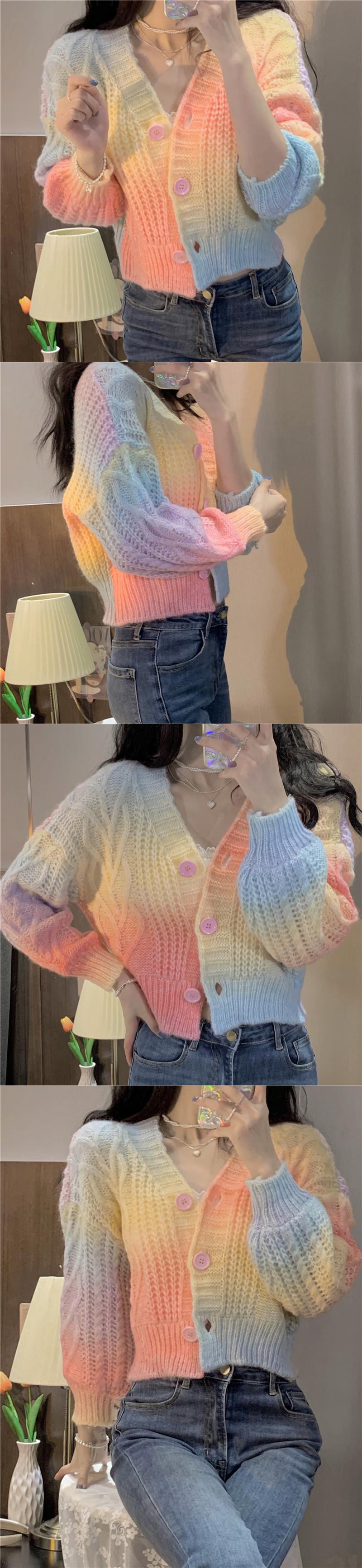 セーターデ秋のレトロワイルドグラデーションVネックレインボーニットセータータイダイツイストカーディガンクロップジャケットプルセクシー オータム 秋物 asa42887862910