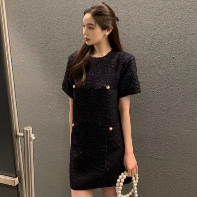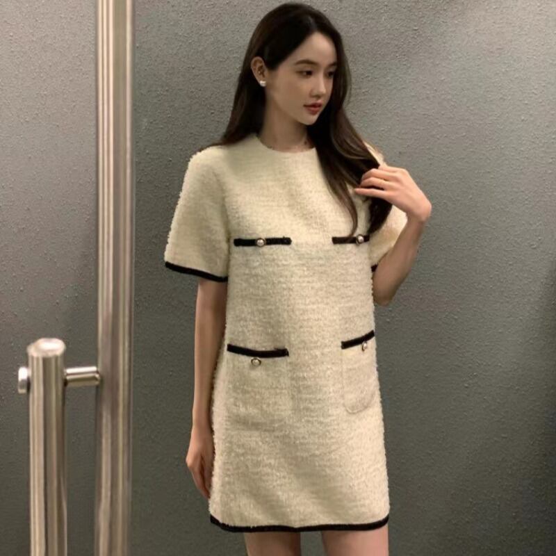 コントラストクルーネック半袖ツイードドレス女性 A ラインルーズミニ Vestidos デローブウエストドレス ショート ハーフスリーブ Aライン asa14849304588