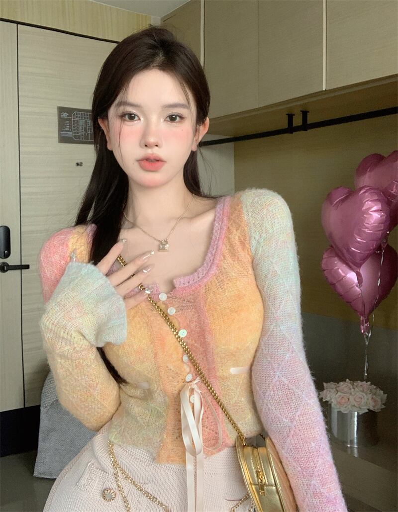 シックなボタン包帯トップス中空フック花トランペット スリーブ ニット カーディガン クロップ グラデーション レインボー セーター薄いシャツ フラワーデザイン asa70489165258