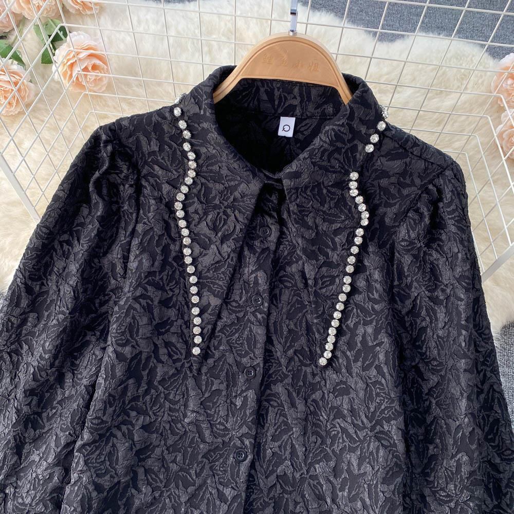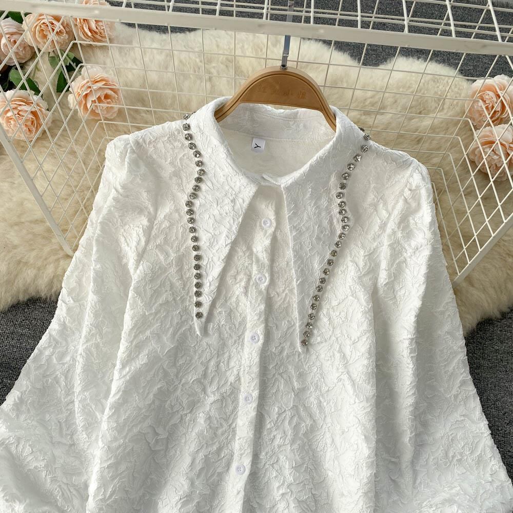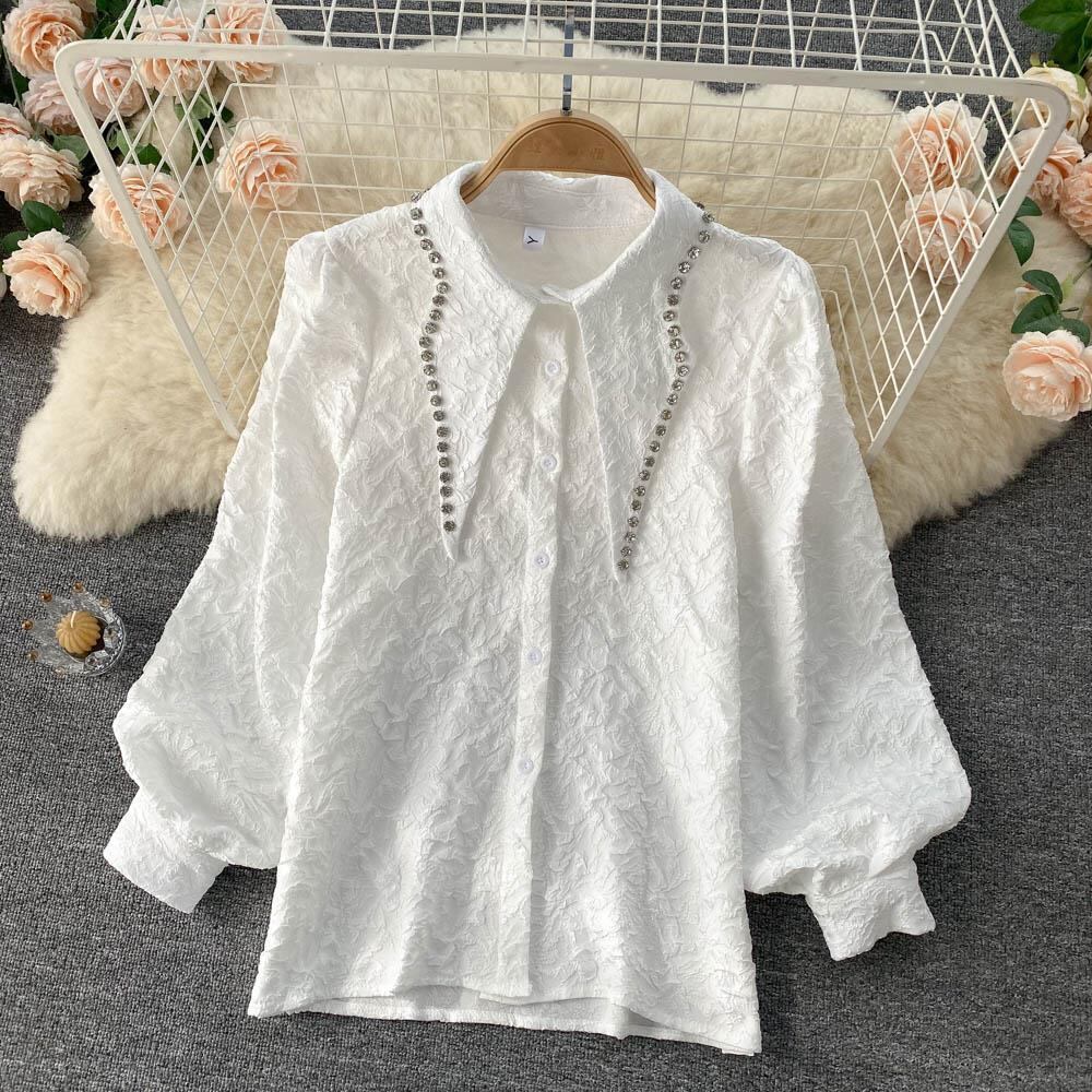 De Moda ダイヤモンド ラペル パフ スリーブ ホワイト シャツ女性トップス秋のブラウス ジャカード シャツ オータム 秋物 asa95329919784