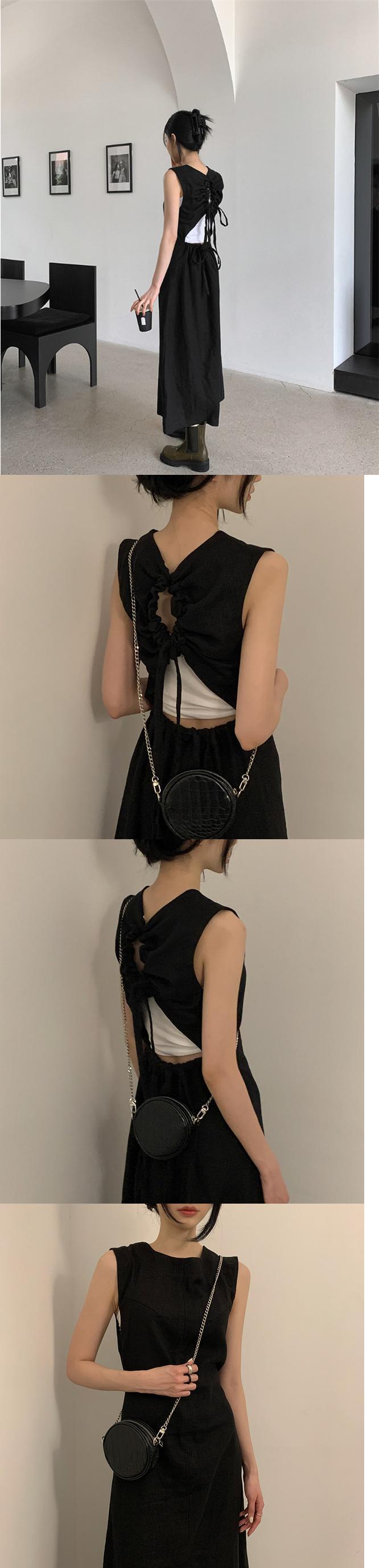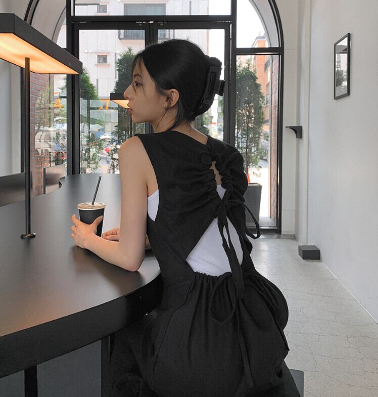 夏巾着オープンバックコットンリネンブラックノースリーブドレス女性ベストマキシセクシーな Vestido デレースアップ サマー 夏物 asa45834874256