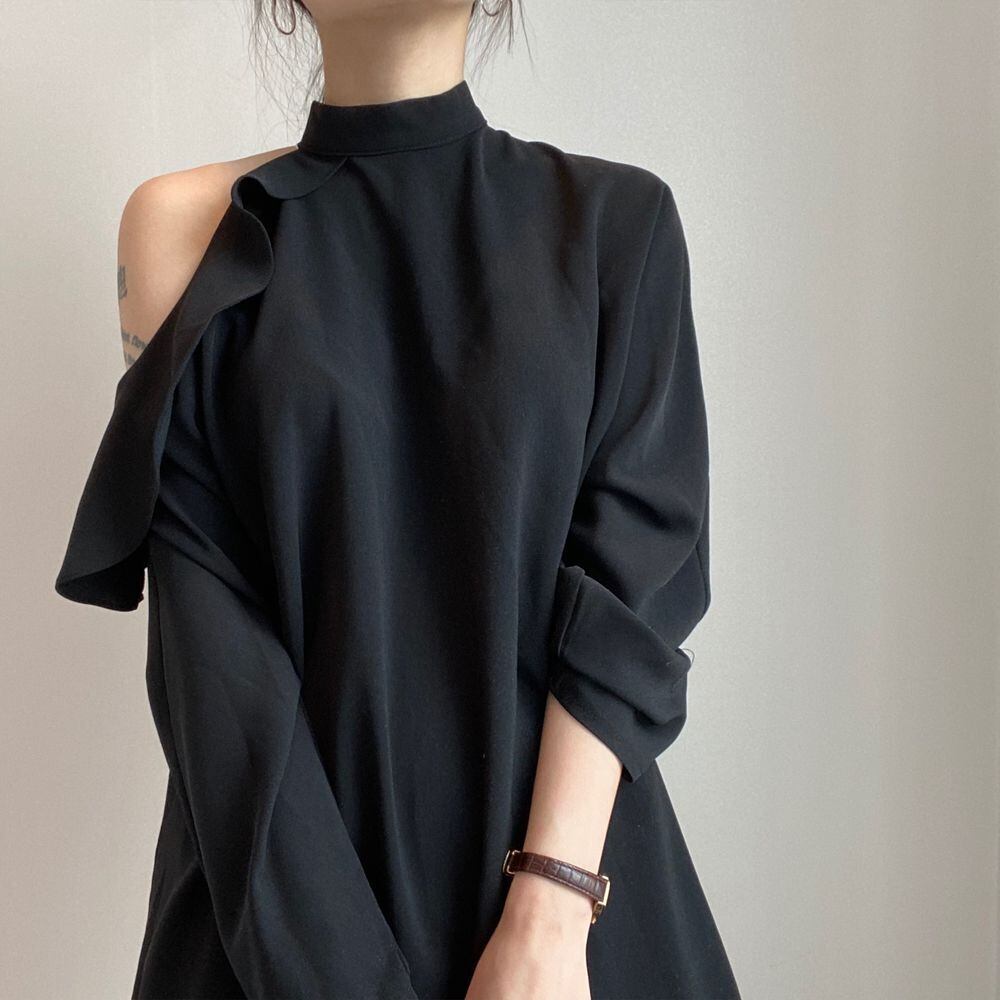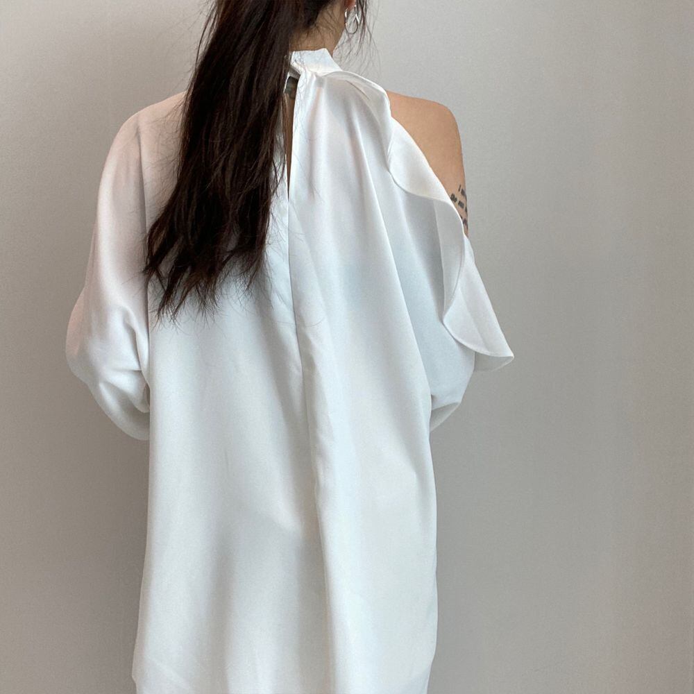 ショートドレス スタンド イレギュラー オフショルダー フリルベルト ウエスト 長袖 白シャツ ブルーサ ゆったりトップス ブラウス ロング ホワイト ハーネス asa90073498420