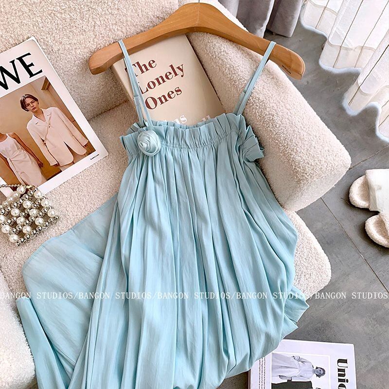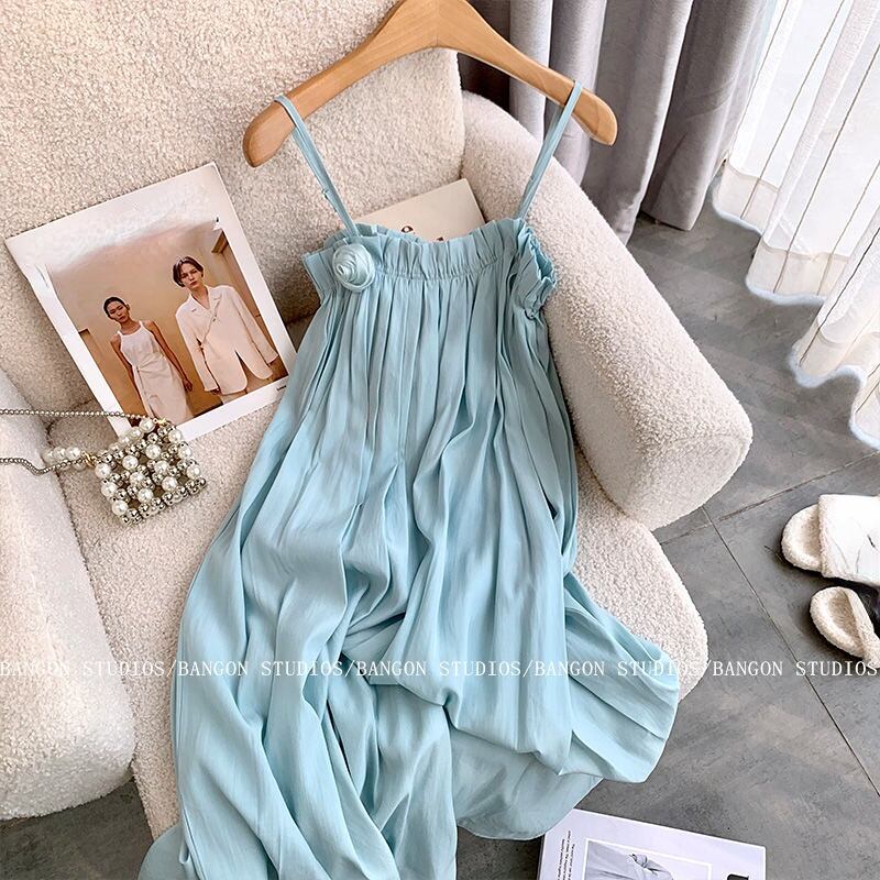 マキシセクシーなビーチブルースパゲッティストラップドレス女性春甘いロングノースリーブプリーツドレス自由奔放に生きる Y2k ルーズ 長袖 大人ガーリー スウィート キュート カジュアル スプリング 春物 asa2020149114