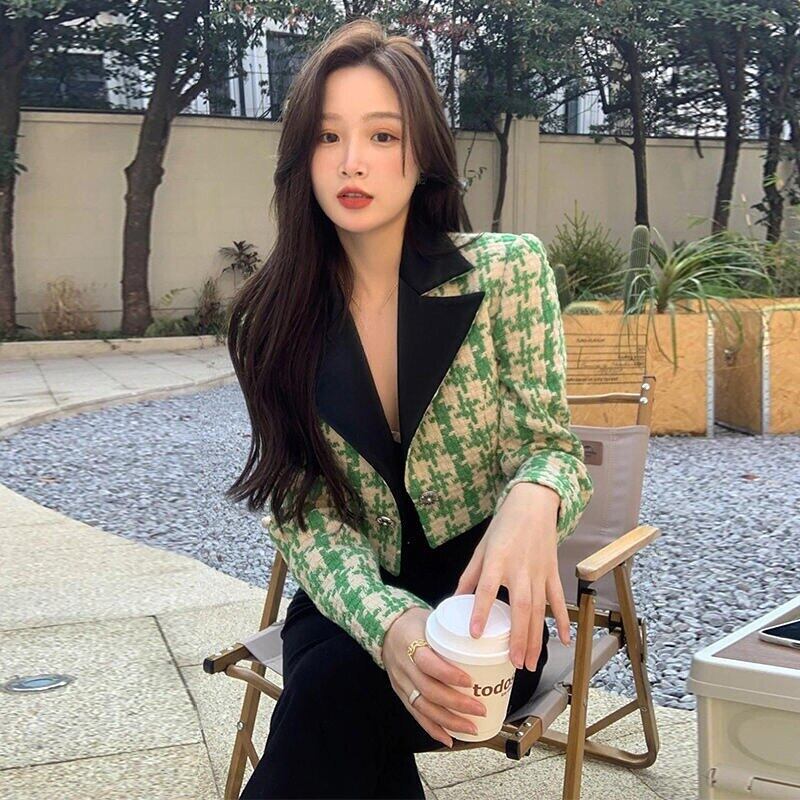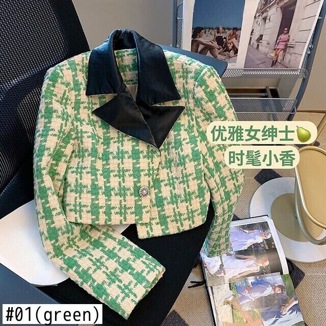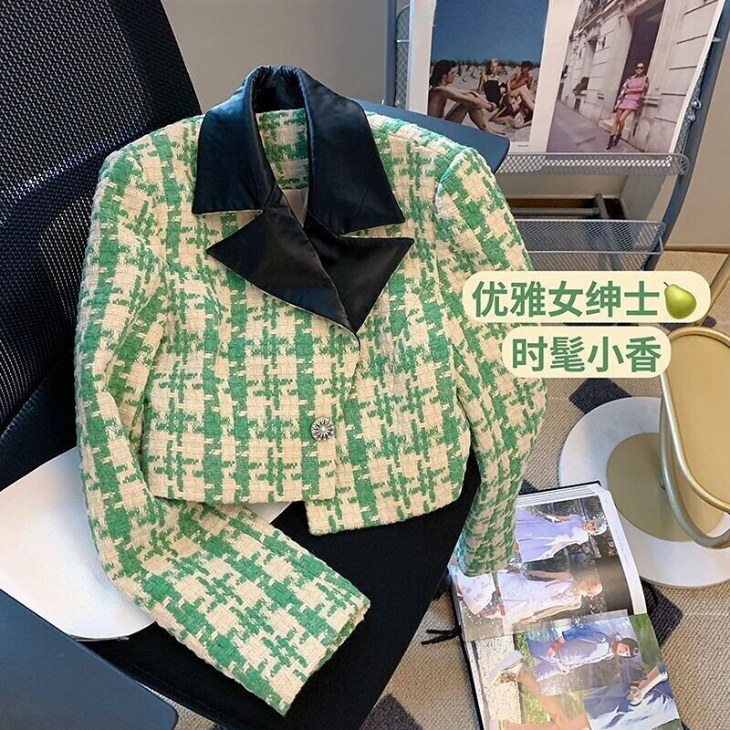 ショートブレザーコートグリーン千鳥格子ジャケット女性ツイードカーディガン秋の長袖スーツ ロング オータム 秋物 asa38267587400