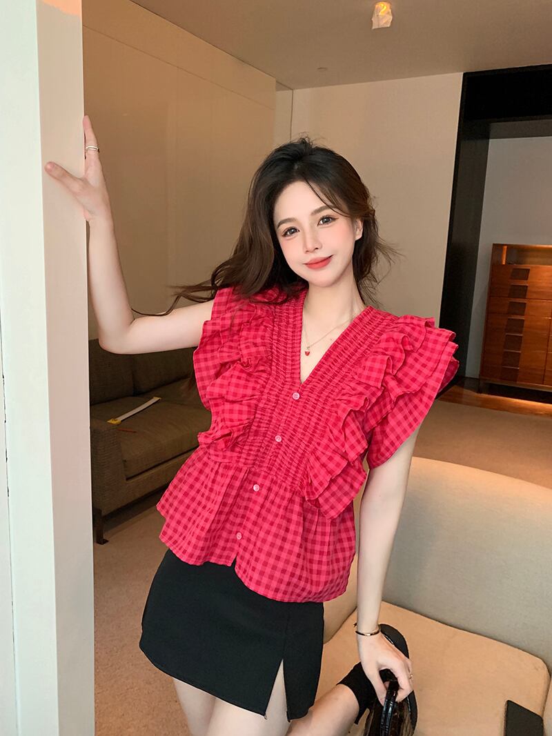 フレンチ V ネック フライ スリーブ チェック柄シャツ プリーツ フリル トップ スリム セクシー な レトロ ブラウス春シャツ クロップ女性服 スプリング 春物 Vネック asa32152412598