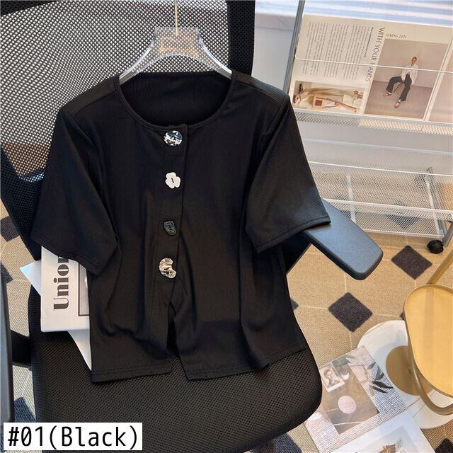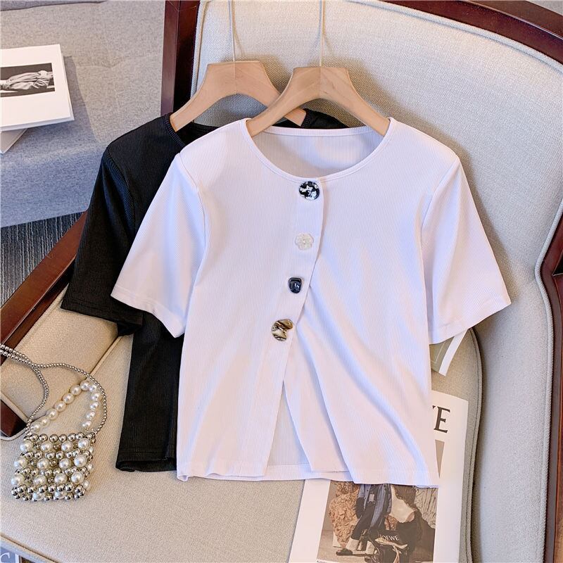 グラフィックTシャツ シック ボタン ルーズ Oネック 半袖Tシャツ コットン クロップトップス スプリット ハーフスリーブTシャツ ホワイトトップ ワイルド ショート asa65164201553