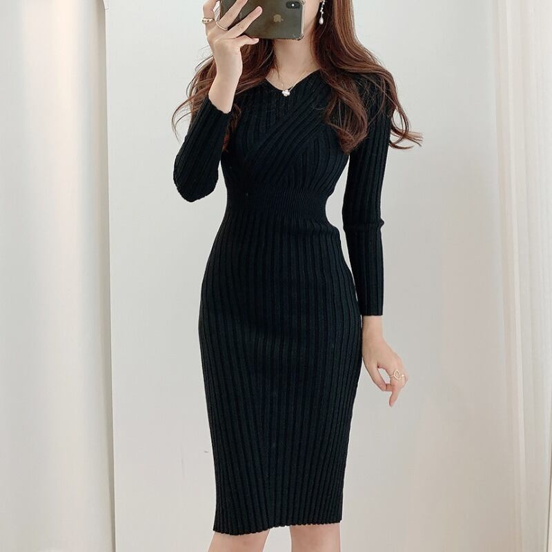 Vestidos V ネックヒップラップカーキ長袖ニットドレス女性ローブスリム黒セーター Y2k ドレスボディコン ロング ブラック Vネック asa6229113434