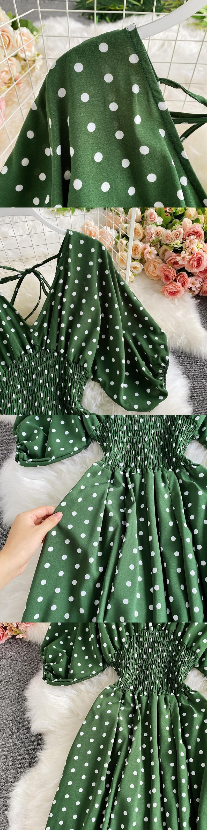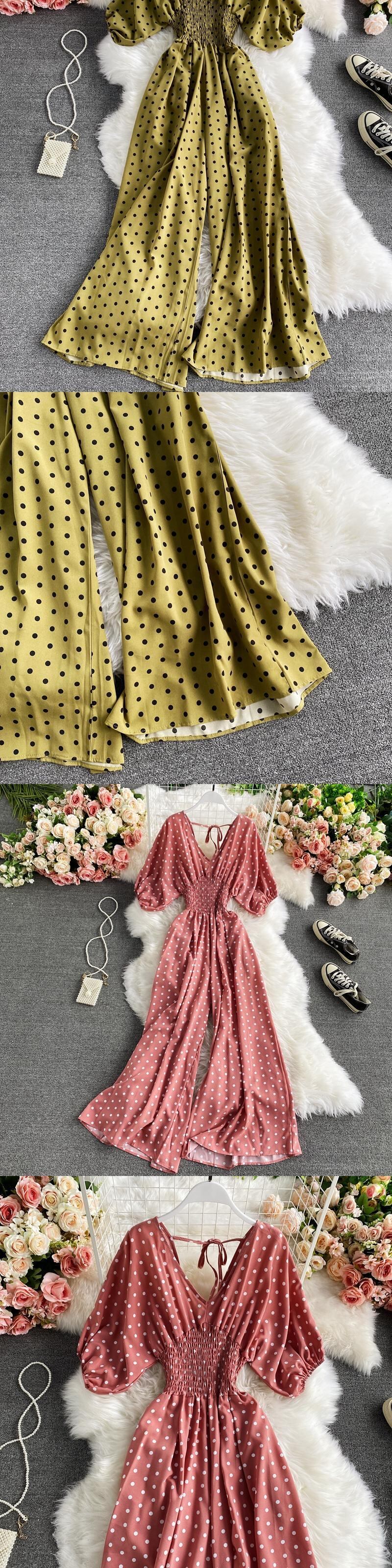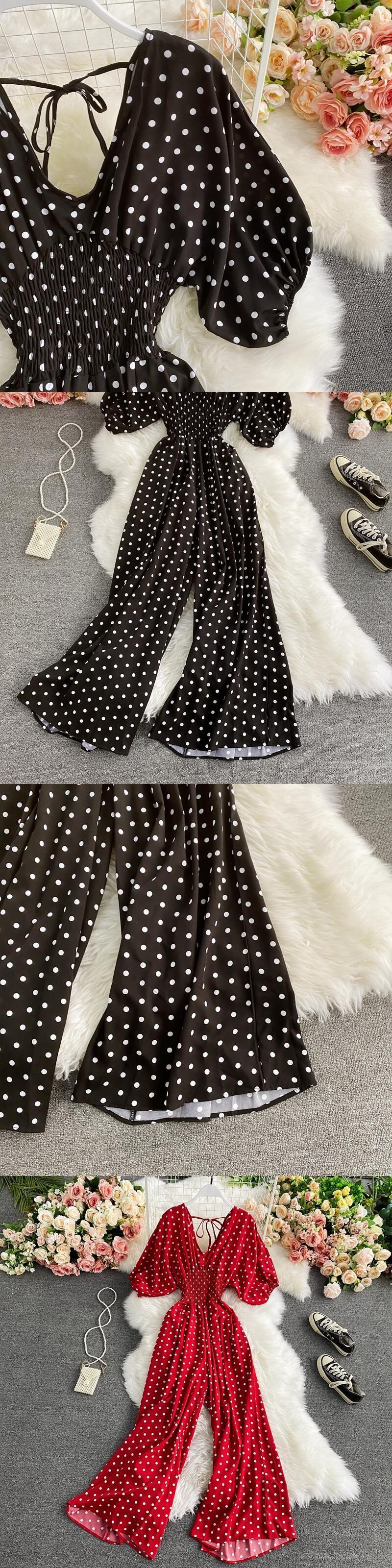 スリムウエストセクシーな V ネックバットスリーブレッドポルカドットジャンプスーツ女性ワイドレッグシフォンロンパースレトロ全体的なレースアップビーチ Vネック ワイドパンツ asa50865260449