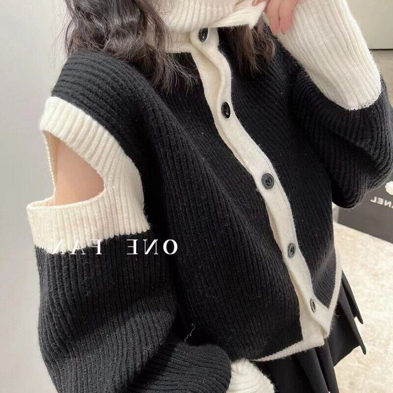グレーオフショルダーセーターニットカーディガンコントラストシングルブレストタートルネックセーター女性ジャケットプル asa1290003656