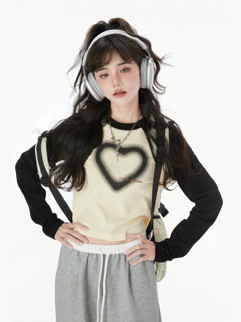 スリムラグランスリーブ Tシャツハートプリント Y2K プルオーバースウェットシャツの女性服 ese 原宿パーカートップス かわいい asa79934237027