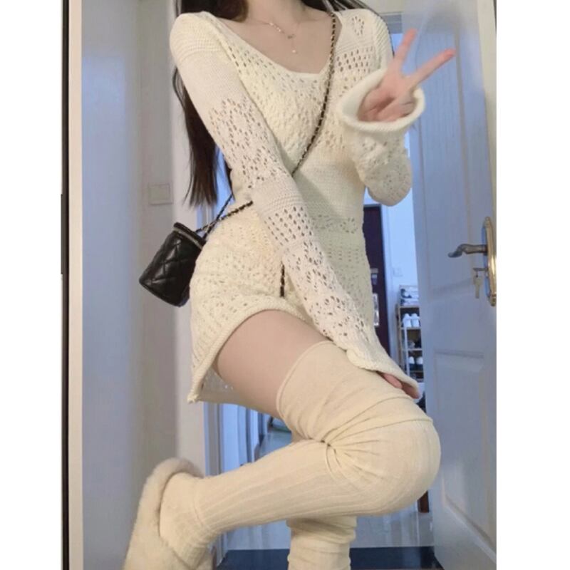 スリムウエストラップヒップローブミニ V 中空長袖ニットドレス女性春ボディコン Vestidos デ ロング スプリング 春物 asa4774180287