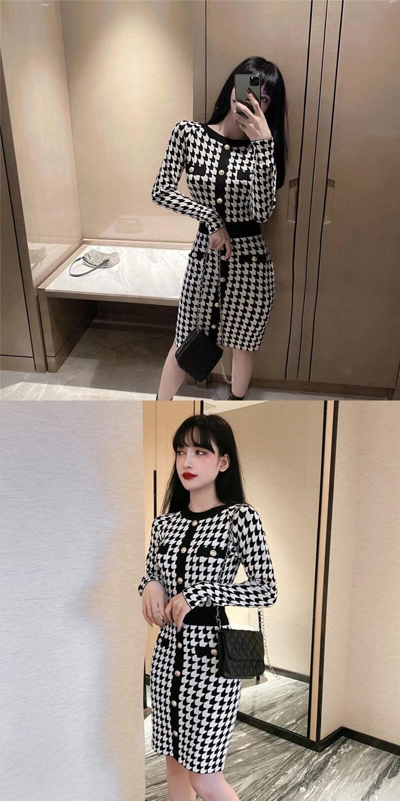 Oネックロングスリーブ千鳥格子ドレスボディコンラップヒップVestidosヒットブラックホワイトニットドレス 長袖 asa16177715297