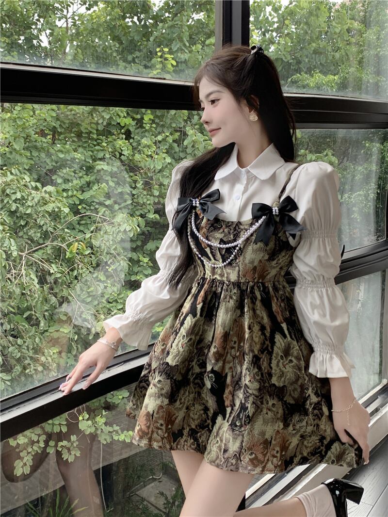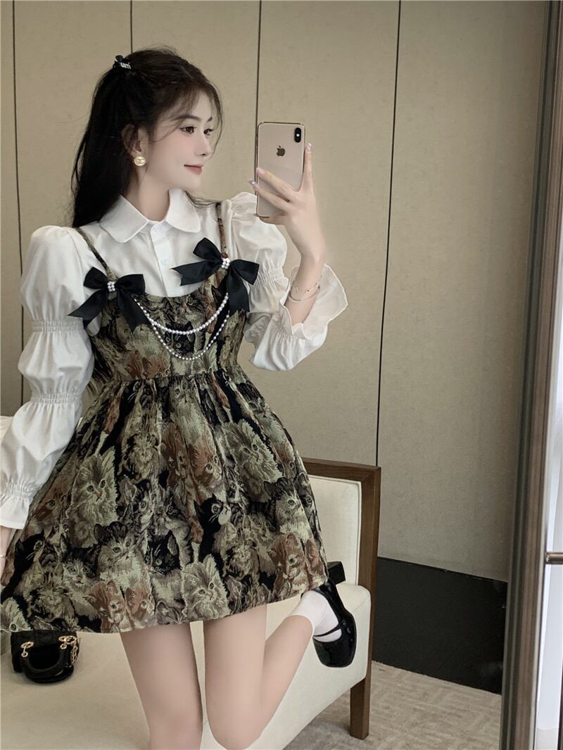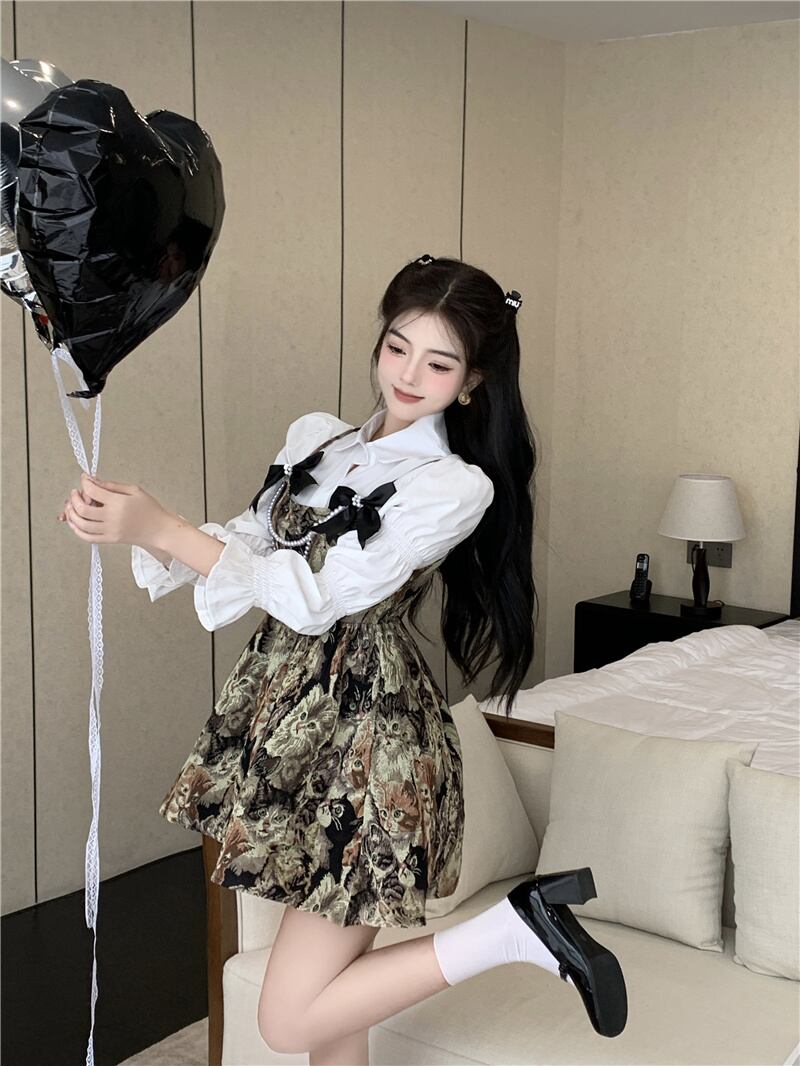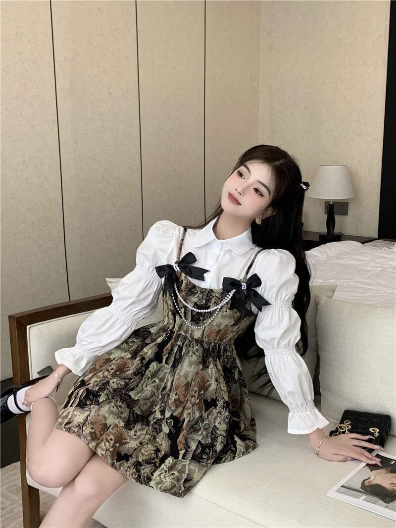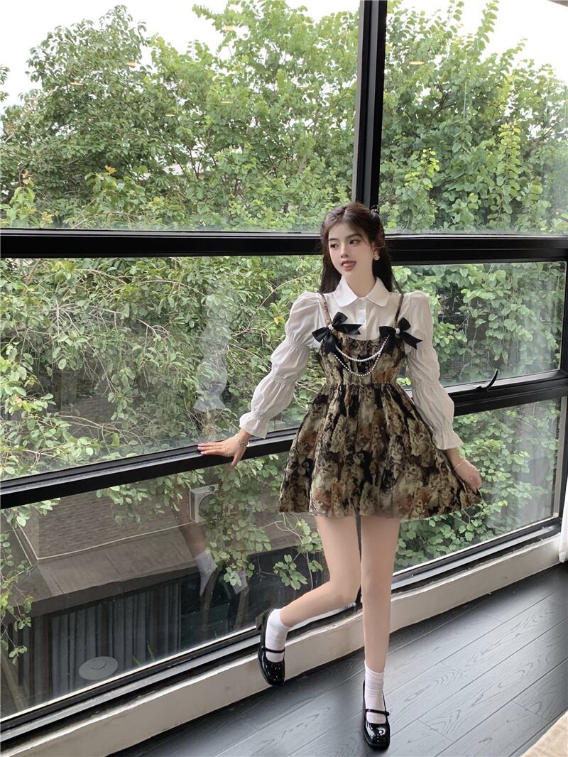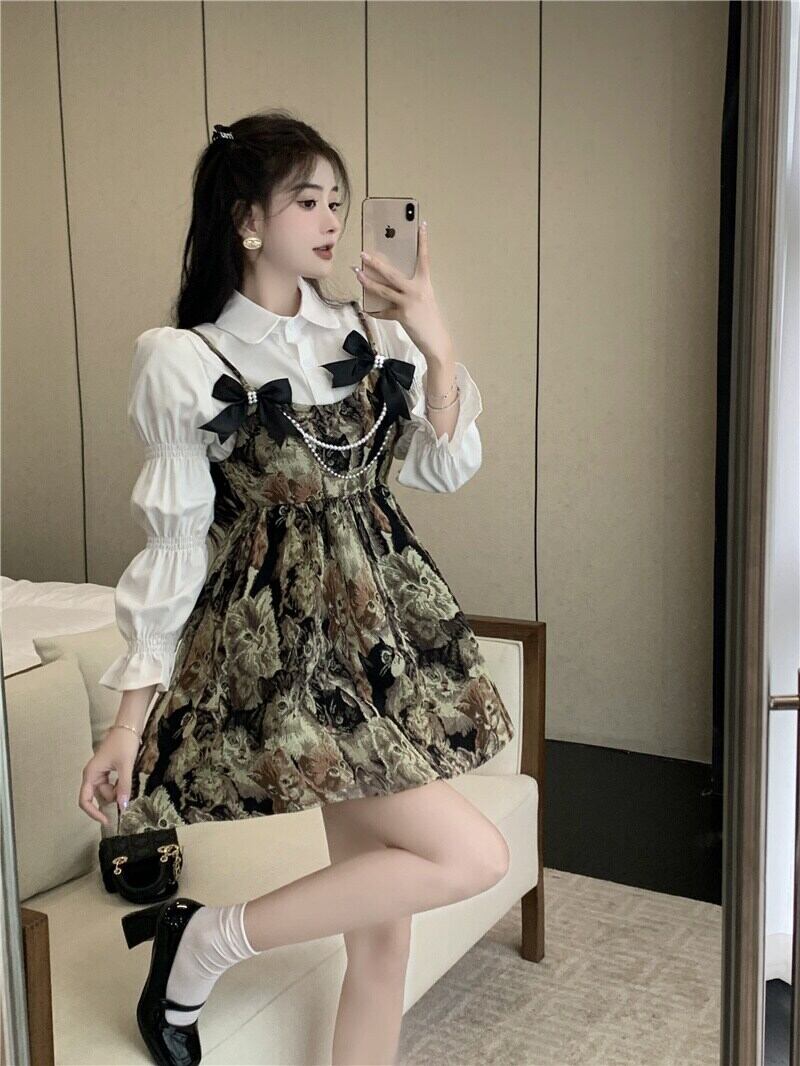 ミニ弓ストラップふくらん花ドレス長袖白シャツ女性 2 点セット女性秋のシックなプリントトップスプリーツブラウス ロング ホワイト リボン オータム 秋物 花柄 asa55429633596