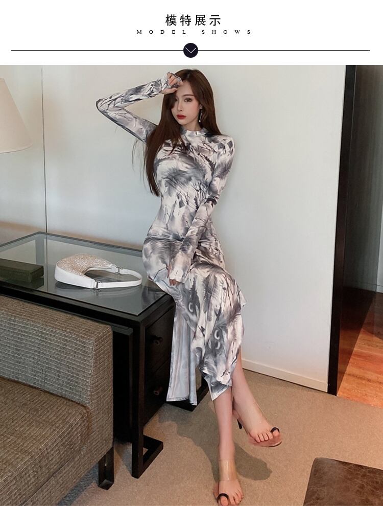 ローブ春スリムセクシーなレトロプリントスリットドレス女性ラップヒップ O 長袖中国風の服 ロング スプリング 春物 asa39970802522