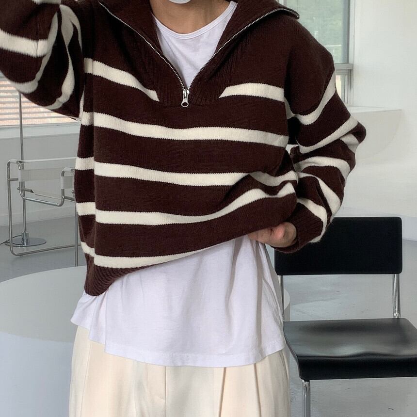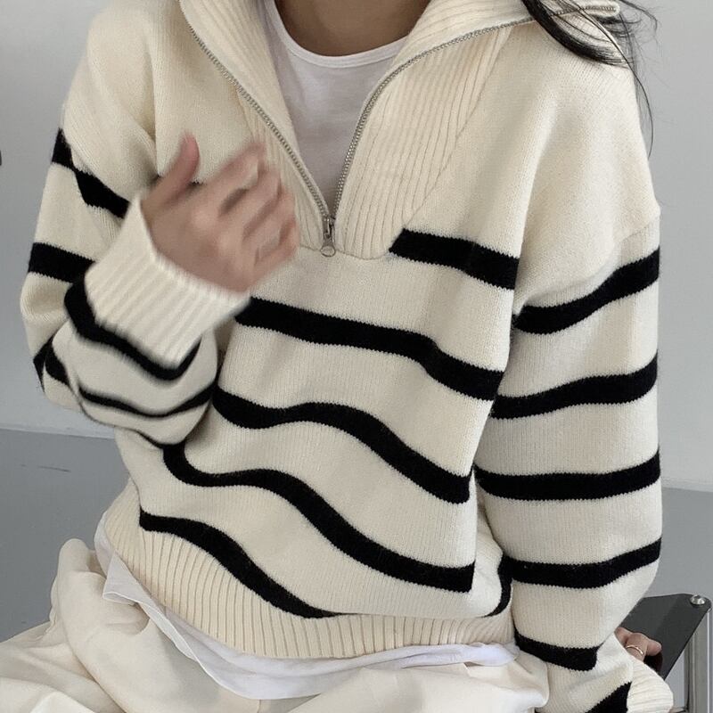 プルオーバー長袖タートルネックのセーターの女性はラペルジップニットストライプのセーターの女性のレトロなセーターデ ロング asa77952887519