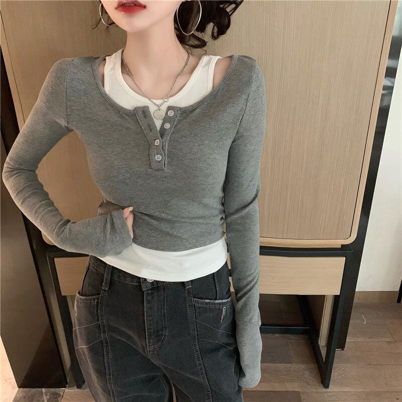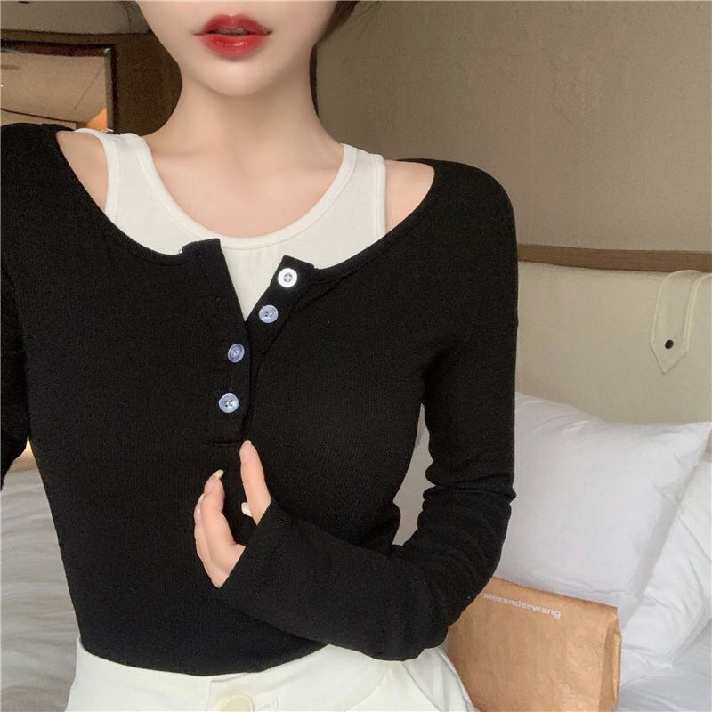 グラフィック Tシャツフェイクツーピースクロップトップスセクシーな長袖 Tシャツシックグレートップス O オフショルダー Tシャツ Tシャツ春スリム ロング スプリング 春物 asa72480819676