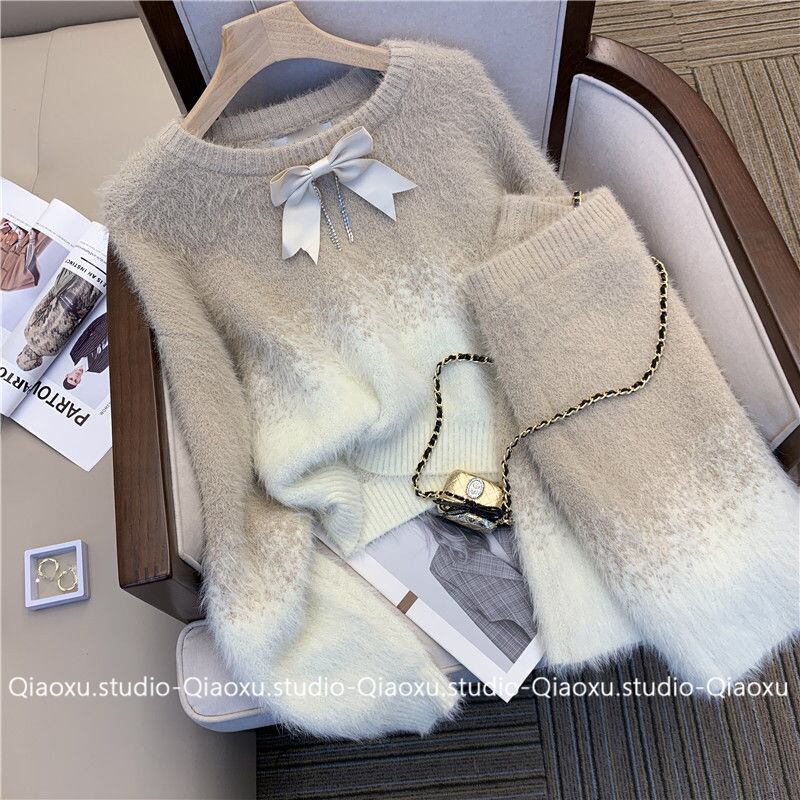 プルオーバー クロップド グラデーション セーター レディース トップス 秋 ボディコン ミニスカート ファー 2点セット asa74027914957