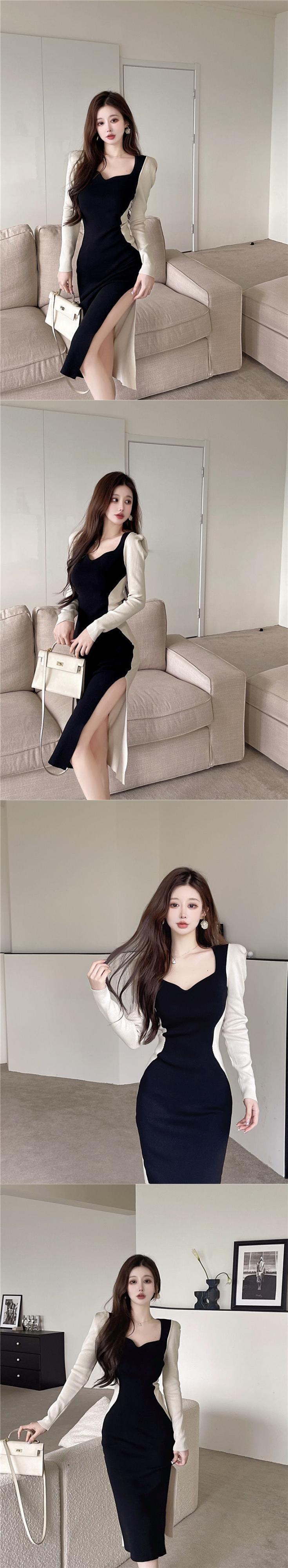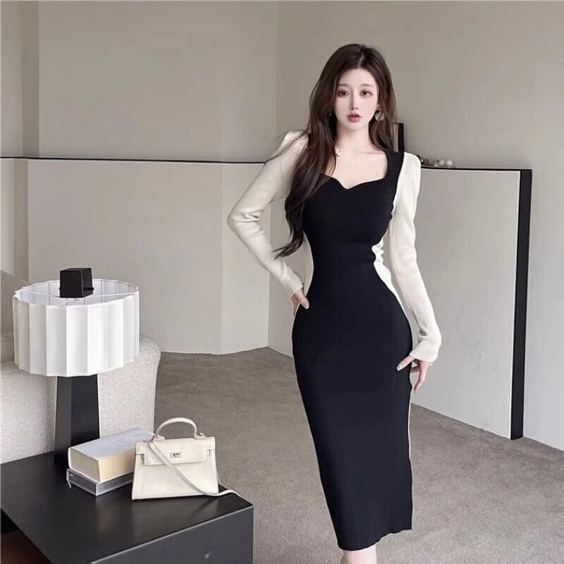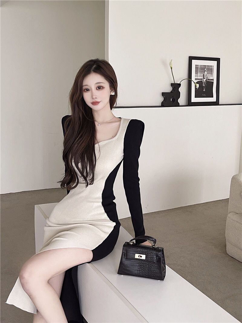 スリム コントラスト ボディコン ドレス レトロ ローブ ウエスト スクエア カラー女性ニット ドレス秋 Vestidos スクウェア asa53831017835