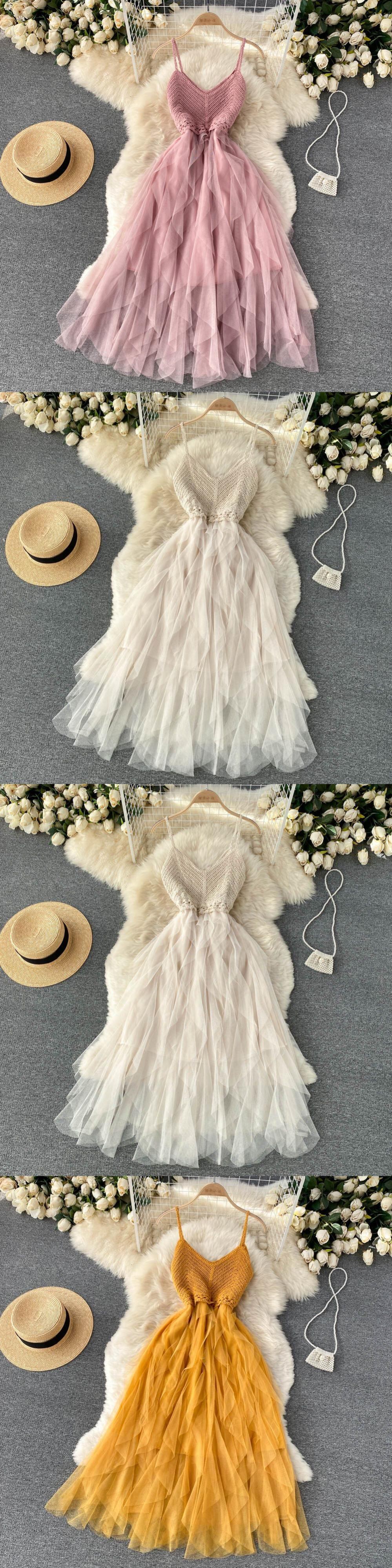 セクシーなスパゲッティストラップ不規則なガーゼふくらん妖精ウエストセクシーなビーチ自由奔放に生きる V ネックピンクケーキドレス女性フリルシックな Vestidos Vネック asa3663365096