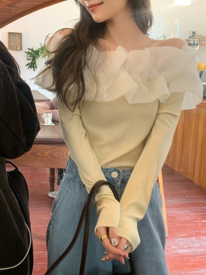 シャツ女性スラッシュネックオフショルダー Tシャツ春メッシュトップス黒 Tシャツセクシーな Y2k Tシャツ服 ブラック スプリング 春物 asa47826221485