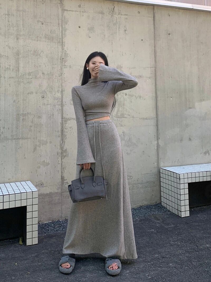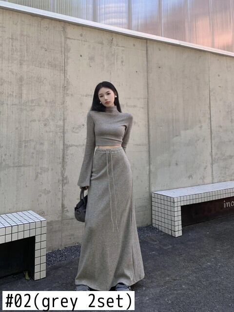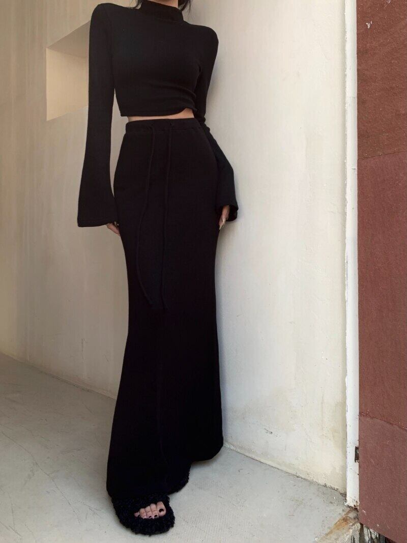 ハーフカラーTシャツトップ長袖ブラウスAラインウエストスカートセット秋の黒Tシャツ ロング ブラック オータム 秋物 asa45570523874
