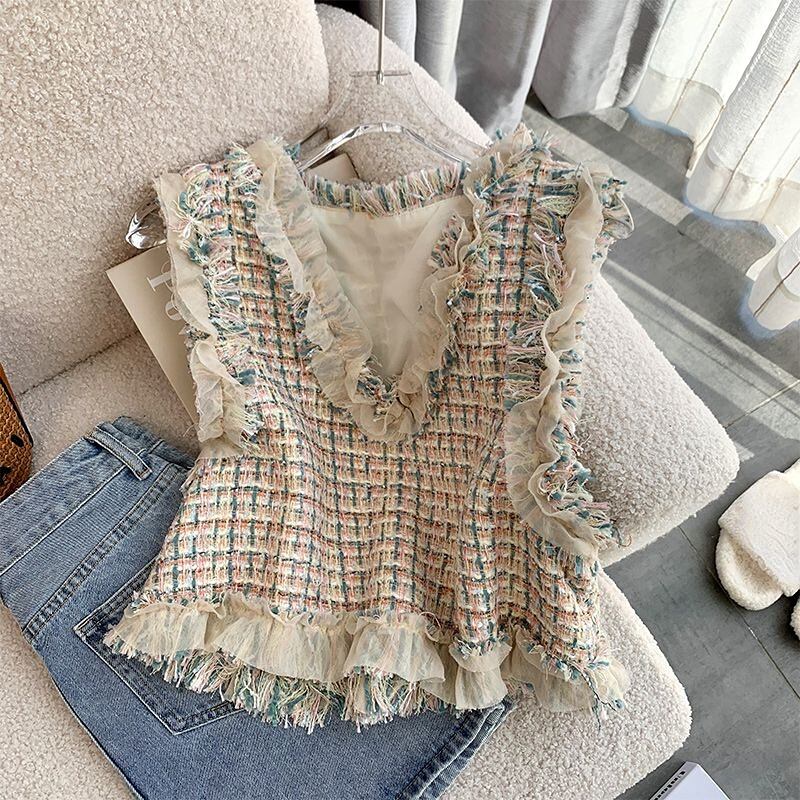 ツイード ベスト スリム クロップ トップス秋コレテ feminino v ネック ニット格子縞の ベスト セーター フレンチ チョッキ フリル ブラウス オータム 秋物 Vネック asa97046945525