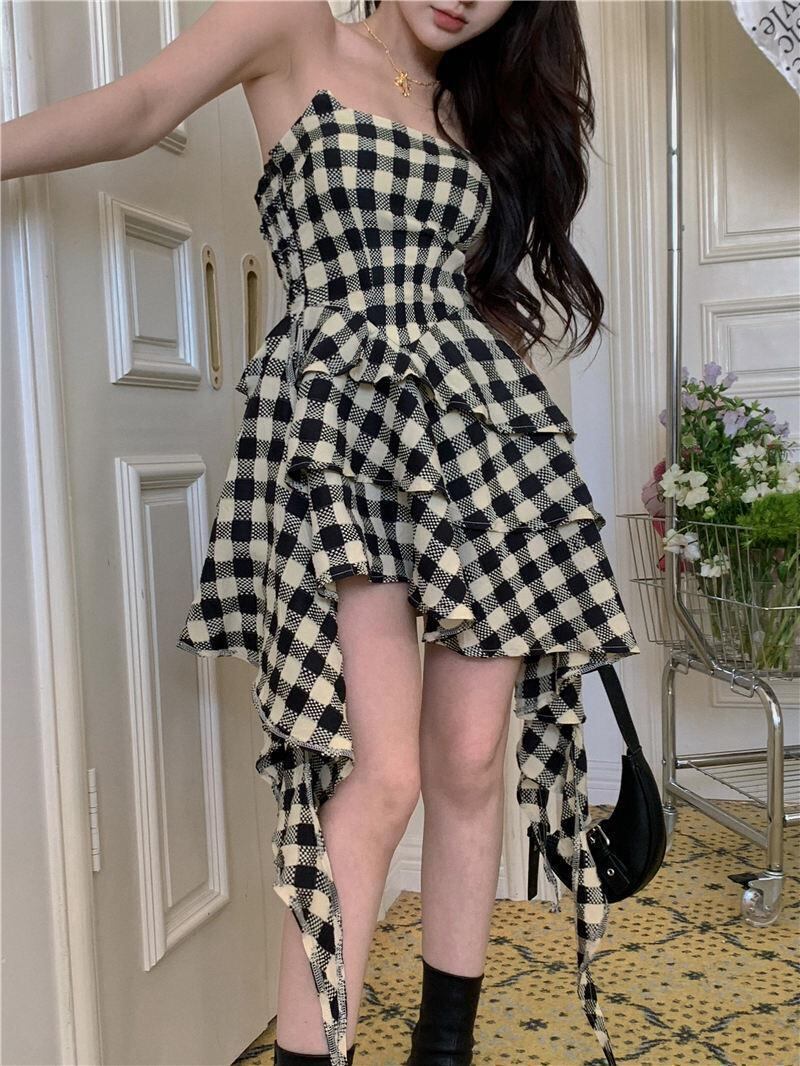 スラッシュオフショルダー黒、白の格子縞のドレスの女性のセクシーな不規則なストラップレスのケーキドレスミニローブ Vestidos デ ホワイト ブラック asa6532294093