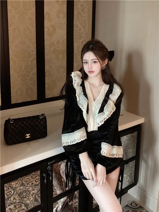 秋のフレンチレースシャツ女性のシックな黒のベルベットシャツフリルブラウスショートカーディガンブラウストップ ブラック オータム 秋物 asa56960638999