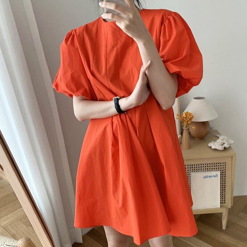 シンプルなルース O ネックパフ半袖ミニ黒のドレスの女性の夏のドレスプリーツウエスト Vestidos デドレス ショート ブラック ハーフスリーブ サマー 夏物 Oネック asa42344655693